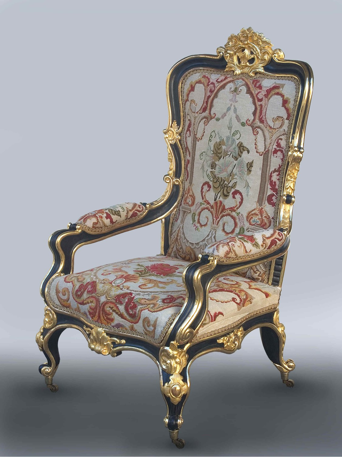 Fotel jest tapicerowany, ma wysokie oparcie, rozłożyste siedzisko i podłokietniki. Wykonany z drewna brzozowego szkielet mebla o esowato wygiętych nóżkach i poręczach ma nietypowo dekorowane profile – politurę w czarnym kolorze i złocone elementy rzeźbiarskie z motywem muszli, liści akantu i campanulli.