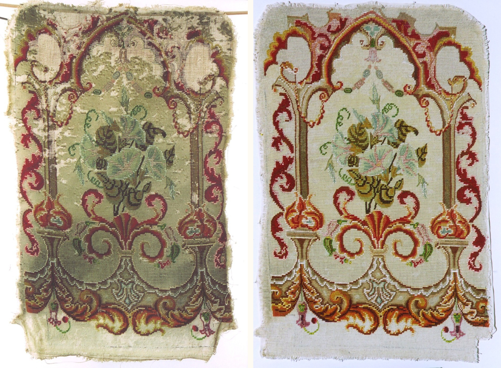 Zaplecek, siedzisko i podłokietniki obite są tkaniną haftowaną na kanwie. Haft krzyżykowy przędzą wełnianą i jedwabną przedstawia na siedzisku kartusz z liści akantu i muszli rocaille, w którego polu wyrasta kwitnący mak, na zaplecku zaś arkadę zamkniętą ostrołukiem wspartym na graniastych kolumnach; w świetle arkady bukiet z błękitnych dzwonków.