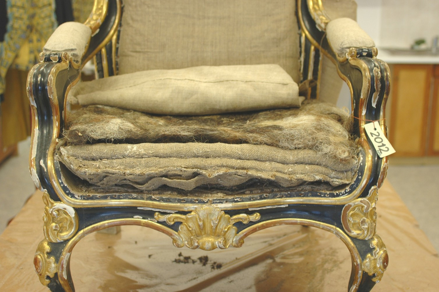 Intensywne użytkowanie mebla w przeszłości i niestabilne dawniej warunki przechowywania spowodowały wiele uszkodzeń: rozchwianie drewnianej konstrukcji, pękanie, odspojenie bądź odpadanie zaprawy kredowo – klejowej, przetarcia złoceń i gruntów. Poduszki tapicerskie zapadły się i zdeformowały. Pierwotnie żywe, jaskrawe kolory haftowanych obić jak czerwienie, ugry, zielenie – spłowiały i zbladły. Brud i kurz zatarł czytelność haftu, a 1/3 jego powierzchni zniszczyły szkodniki wełny.