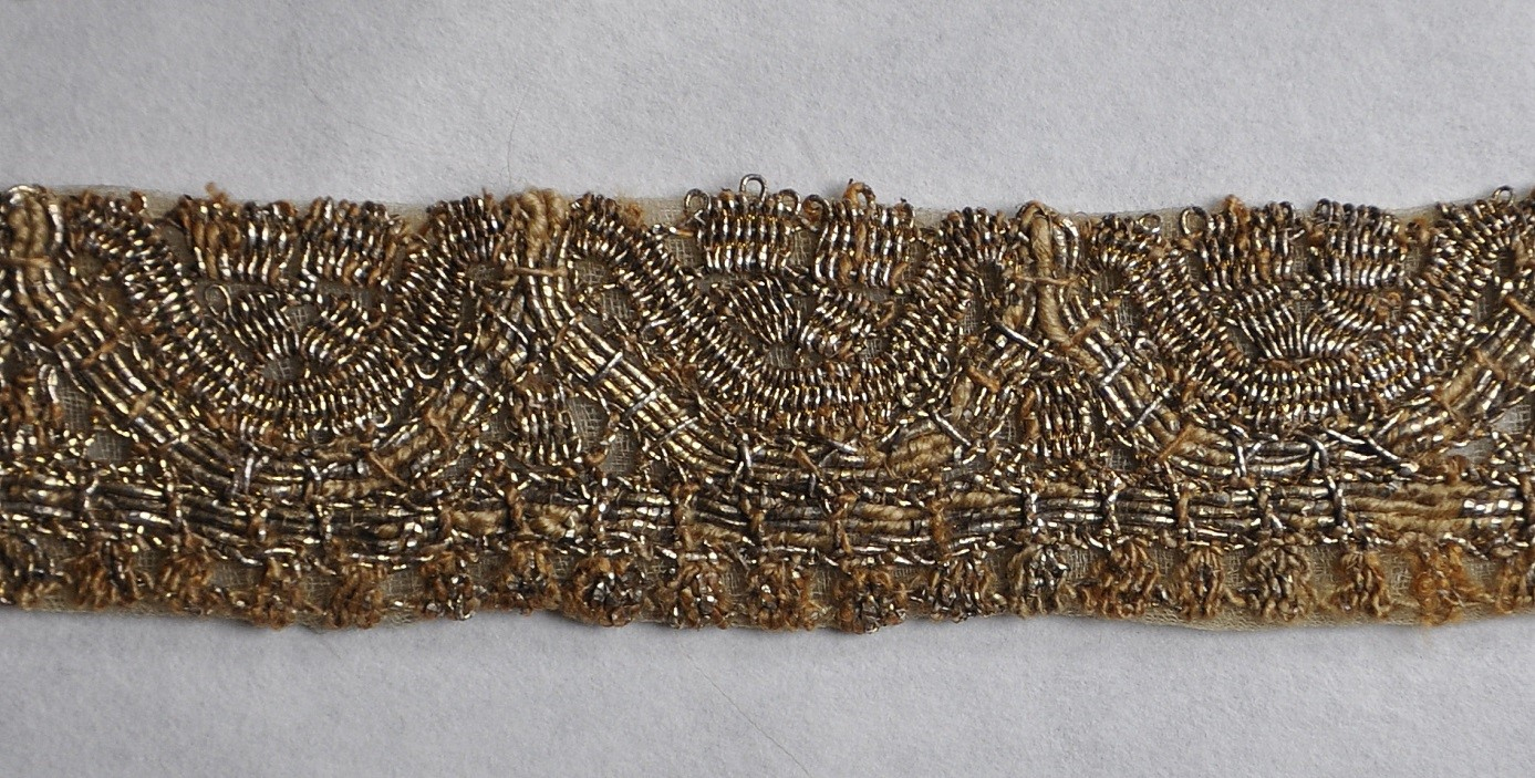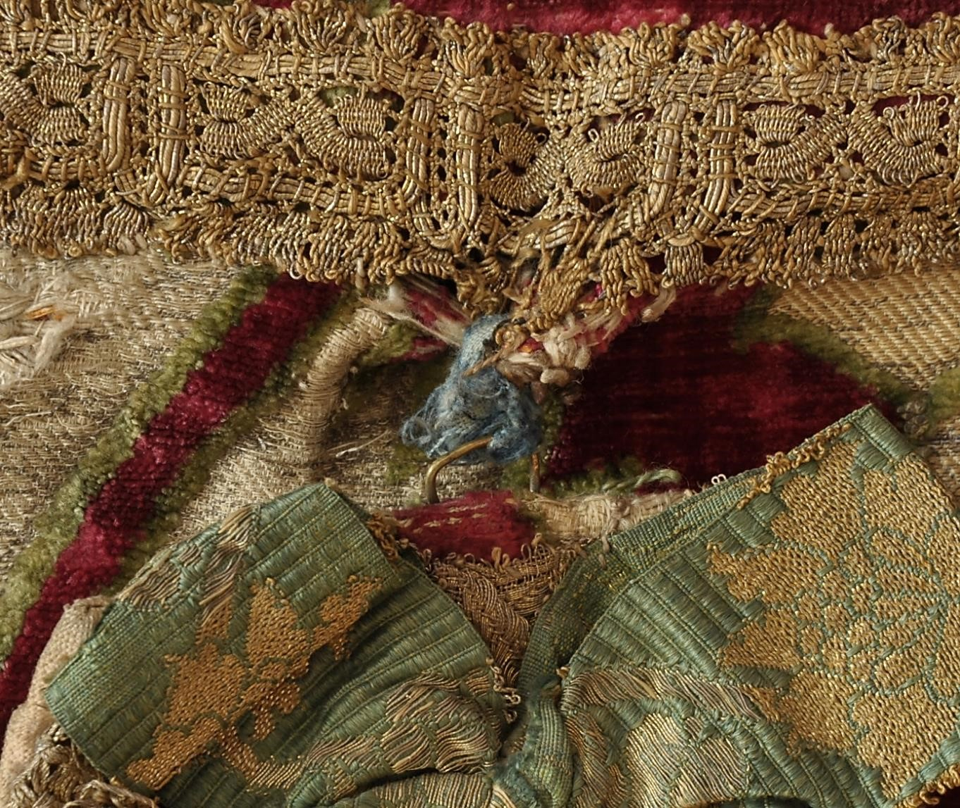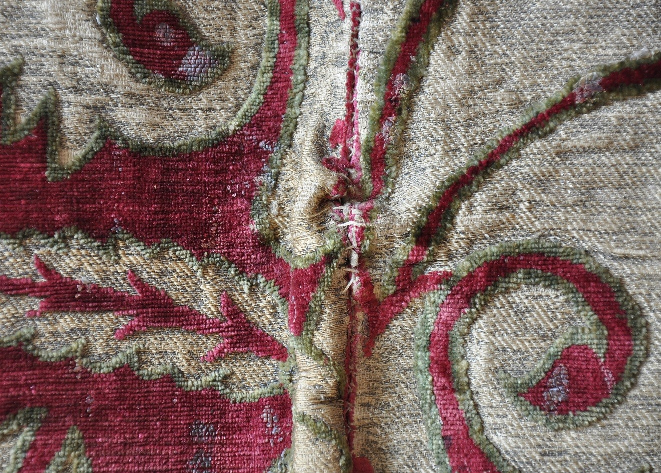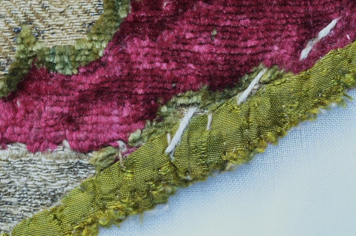 Następnym etapem prac było zabezpieczenie brokatu aksamitnego. Kolejne bryty zostały zdublowane na podkładzie z organzy jedwabnej, ściegami punktowymi – w wypadku zabezpieczenia uszkodzonych metalowych nitek wątku broszowania – lub w systemie siatki konserwatorskiej, co 3 mm – w przypadku miejsc z brakującą osnową.