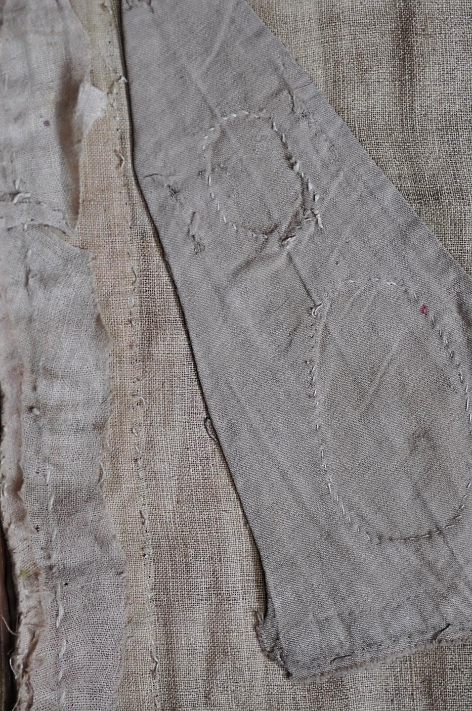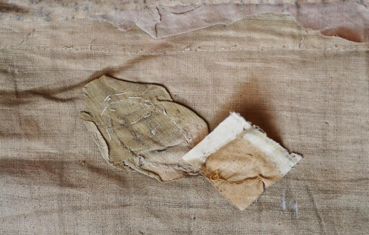 W bardzo „interesujący” sposób poradzono sobie z brakującym haczykiem do umocowania kaptura. Haczyk został zastąpiony fragmentem niebieskiej tkaniny, przy pomocy której przywiązano kaptur do uszkodzonych wątków. Ten z pozoru nieważny kawałek tkaniny jest dowodem na to, że naprawy były wykonywane na miejscu, zapewne przez osobę dobrej woli, ale kompletnie pozbawioną umiejętności, choć niepozbawioną sprytu.