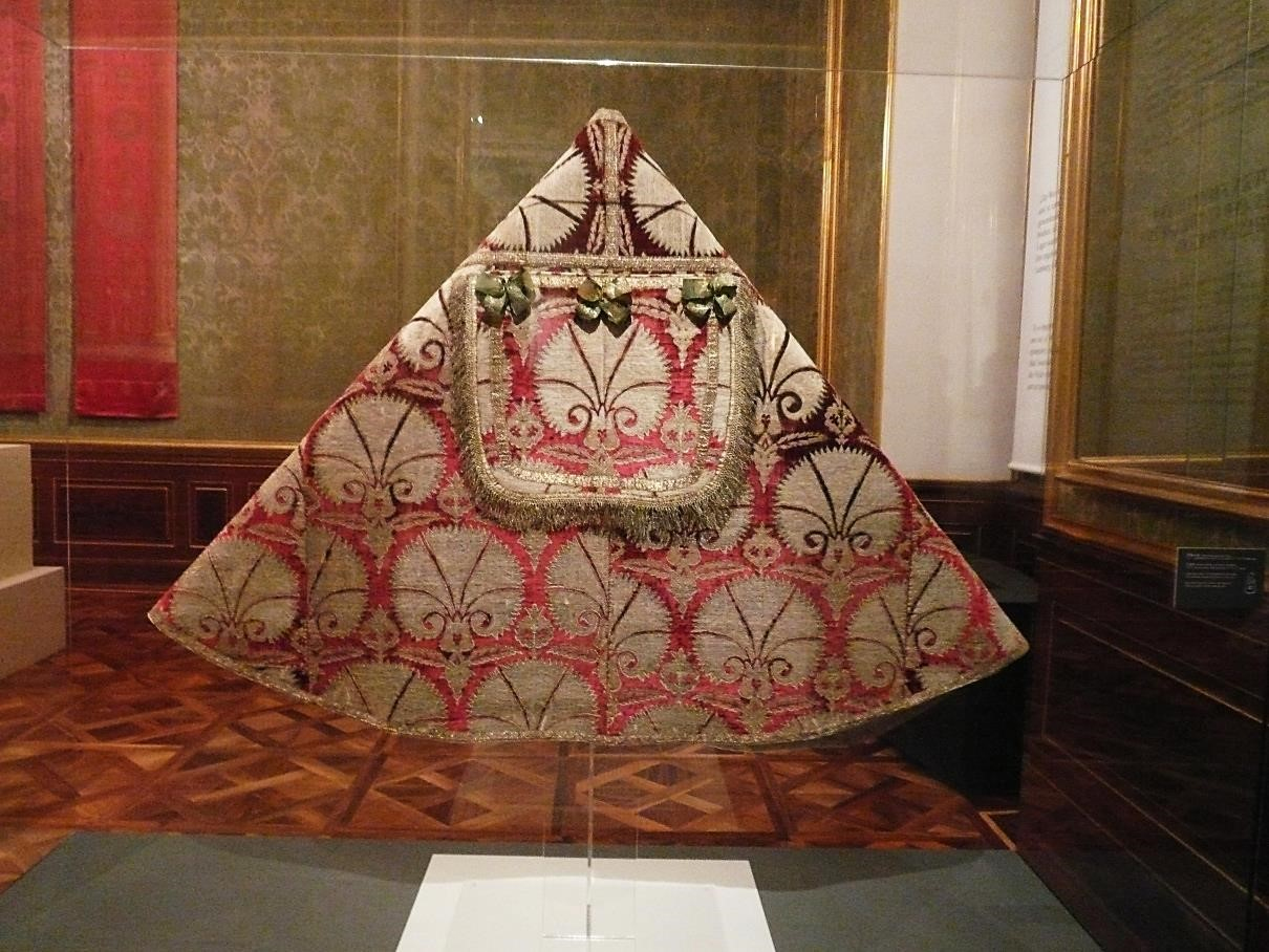 Po demontażu można było stwierdzić, że uszyto ją z czterech pełnych brytów tkaniny z zachowanymi brzegami warsztatowymi i piątym przedzielonym na pół. Ten ostatni jest najbardziej interesujący, bowiem zachowała się na nim krajka pozioma kończąca kupon tkaniny. Na kapie jest to miejsce łączenia pasa na środku, ukryte pod fragmentem koronki.