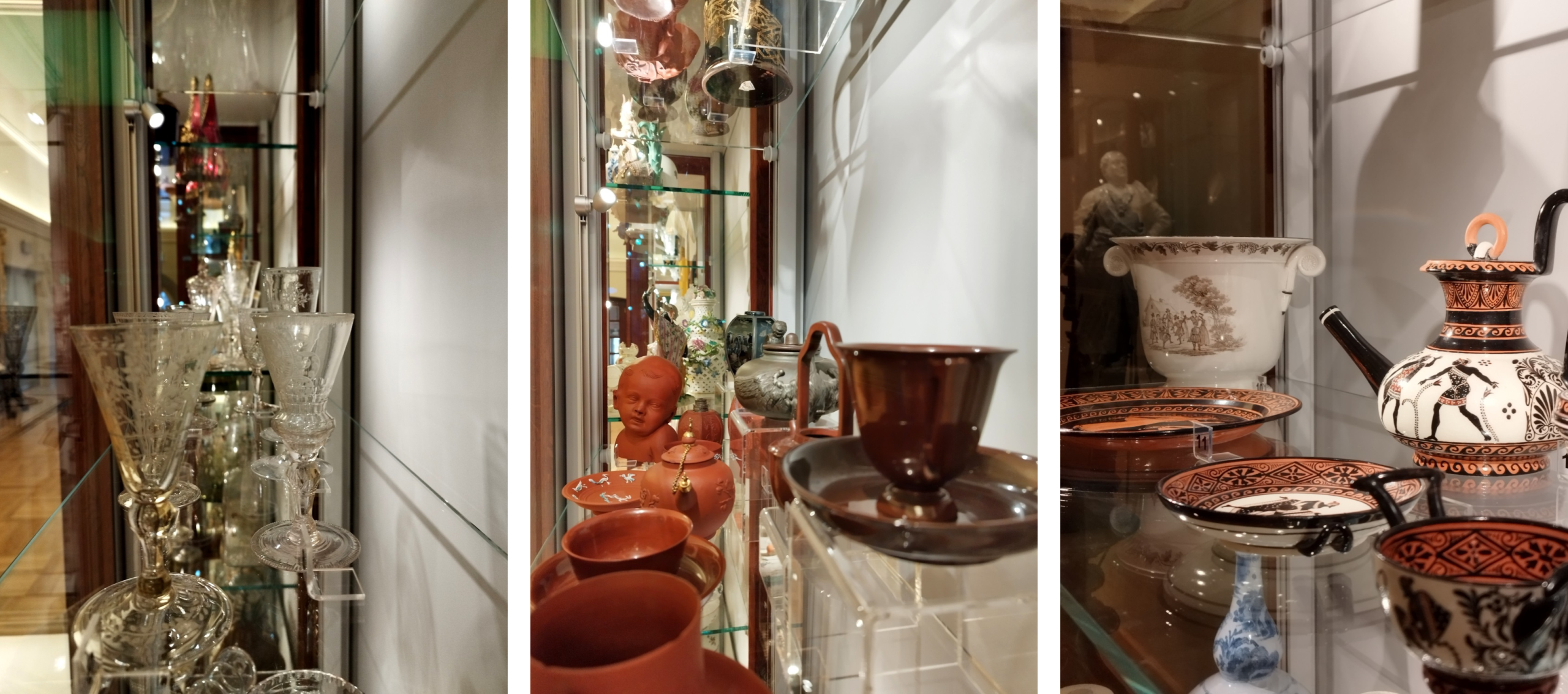 Ekspozycję w Galerii Kolekcji Potockich uzupełniliśmy ponadto o liczne obiekty używane niegdyś przez mieszkańców pałacu wilanowskiego. Obok porcelany pojawiły się elementy zastawy stołowej z herbem Potockich, a obok kulawki – szkło użytkowe z polskich hut magnackich, takich jak Huta Krysztalowa rodziny Sieniawskich. W jednej z szaf prezentujemy twarde naczynia z czarnej i czerwonej kamionki, której receptura została wypracowana przez Johanna Friedricha Böttgera. Uwięziony na dworze króla Augusta II Mocnego alchemik miał uzyskać złoto, ale zamiast niego zapoczątkował produkcję cennej europejskiej porcelany, której pierwsza manufaktura powstała w Miśni.