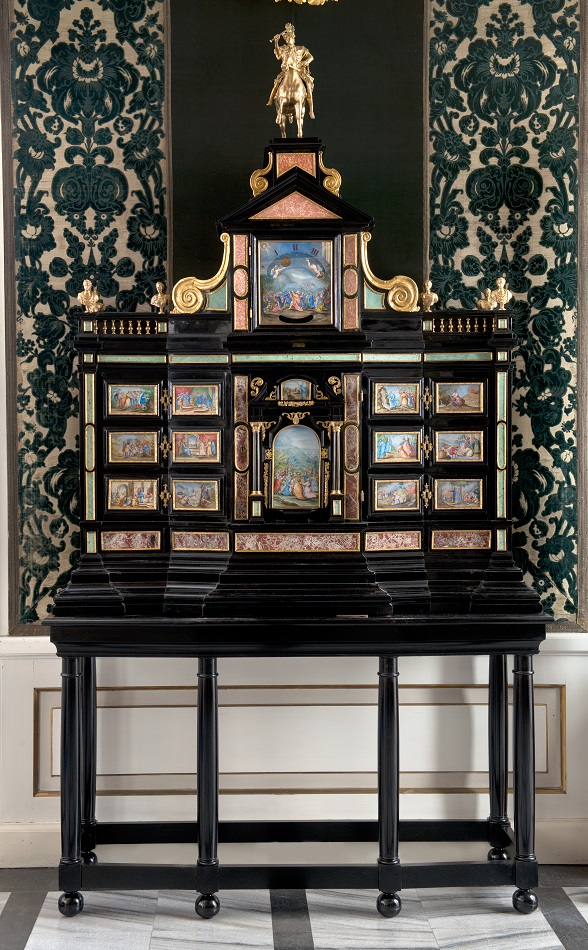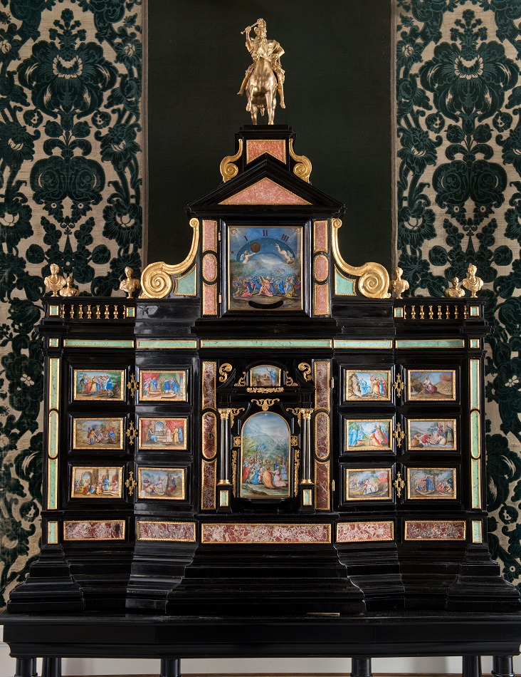 Dzięki dostępowi do oryginału można było dokonywać na bieżąco kolejnych pomiarów i odpowiednio korygować tworzoną kopię. Niestety krakowski kabinet przez stulecia zmienił swoją funkcję i stał się elementem wystroju kościoła, częścią nastawy ołtarza. Liczne jego detale zostały zmienione lub zdemontowane, a wiele z nich zaginęło. W związku z tym jeszcze w trakcie trwania prac konserwatorskich powstało szereg pytań, na które należało poszukać odpowiedzi. Tu z pomocą przyszli nam koledzy z duńskiego Muzeum Zamku Rosenborg oraz sama królowa Małgorzata II, która udostępniła do wglądu jeden z podobnych, dobrze zachowanych mebli, które ma w swoich prywatnych apartamentach. Dzięki uprzejmości muzealników z Rosenborga możliwe było wykonanie kopii okuć zdobiących mebel, w tym konnej figury wieńczącej obecnie kabinet Jana III.