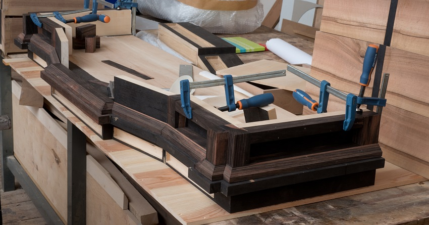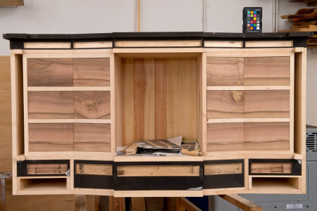 W okresie wypożyczenia sukcesywnie realizowano prace rekonstrukcyjne. Wykonano m.in. kopie miniatur zdobiących szuflady wraz z malowaną tarczą zegarową oraz część mechanizmu zmieniającego (wyświetlającego)[1] godziny. Zrekonstruowano główną skrzynię mebla z odtworzeniem oryginalnie zastosowanych złączy stolarskich[2]. Częściowo odtworzono gzyms i cokół, a powierzchnie boczne pokryto okleiną[3] z użyciem forniru[4] hebanowego.