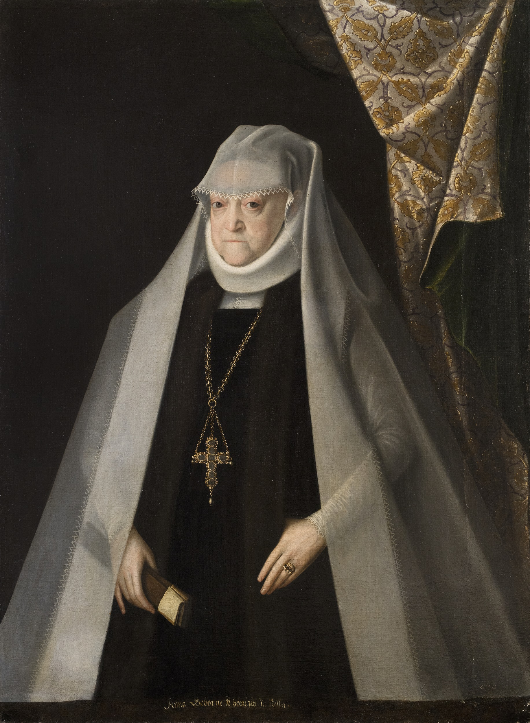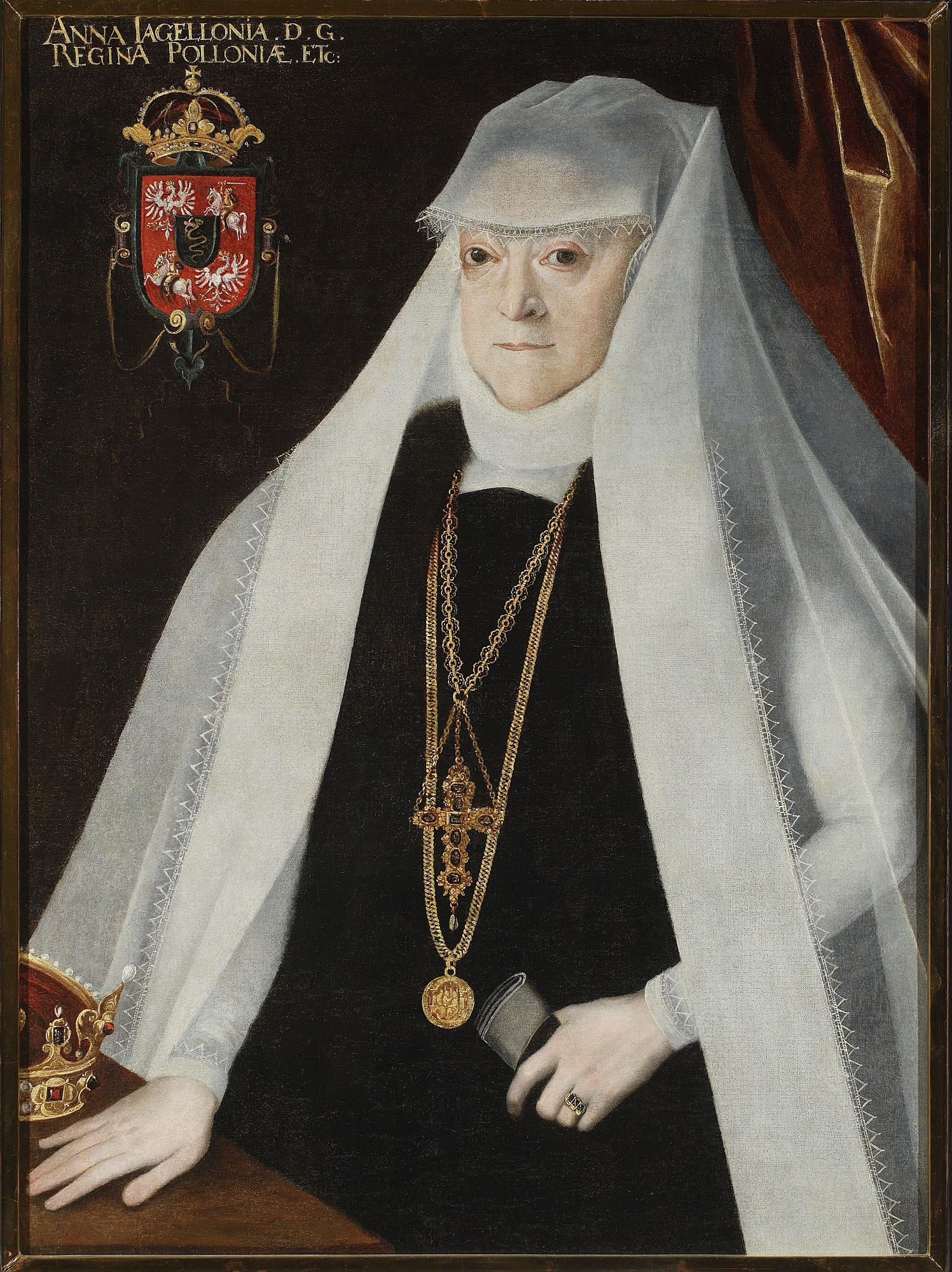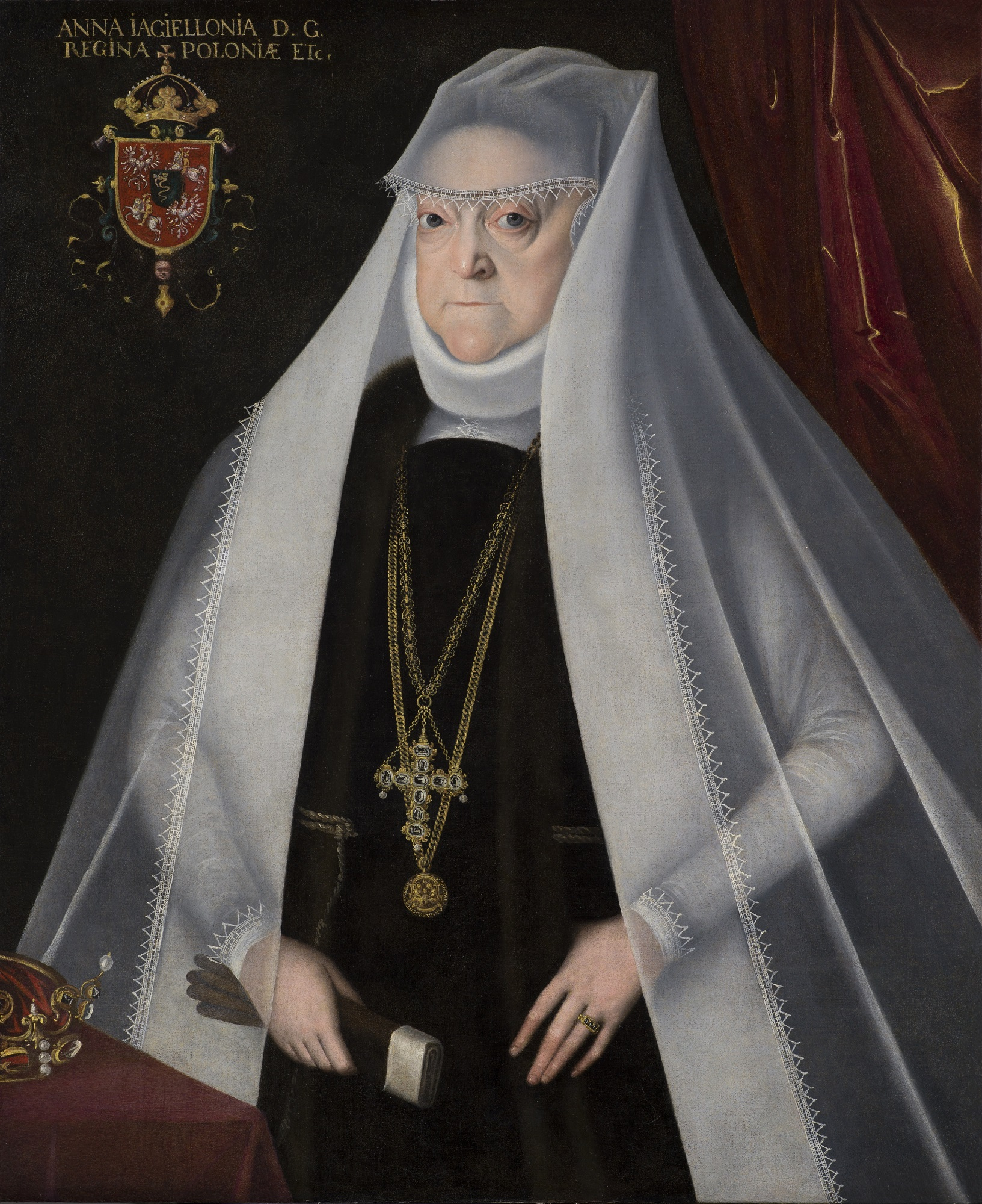 Ciekawostką są klejnoty królowej. Na wszystkich portretach widnieje na szyi kameryzowany krzyż ozdobiony kamieniami. Oryginał, niegdyś znajdujący się w kolekcji Izabeli Czartoryskiej, znamy ze starych fotografii. Na obrazie z Zamku Królewskiego na Wawelu krzyż został odtworzony z niezwykłą precyzją, najprawdopodobniej bezpośrednio z natury. Na czterech wizerunkach królowej widnieje również medalion Bractwa św. Anny. Medalion z portretu wilanowskiego jest dobrze zachowany i można odczytać napis w otoku, podobnie jak na wizerunkach z Muzeum Narodowego i Zamku Królewskiego w Warszawie. Natomiast ten z Katedry Wawelskiej ze względu na zły stan zachowania obrazu można odtworzyć tylko na podstawie badań fizykochemicznych.