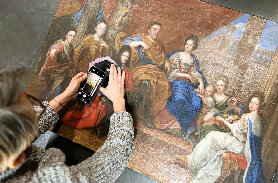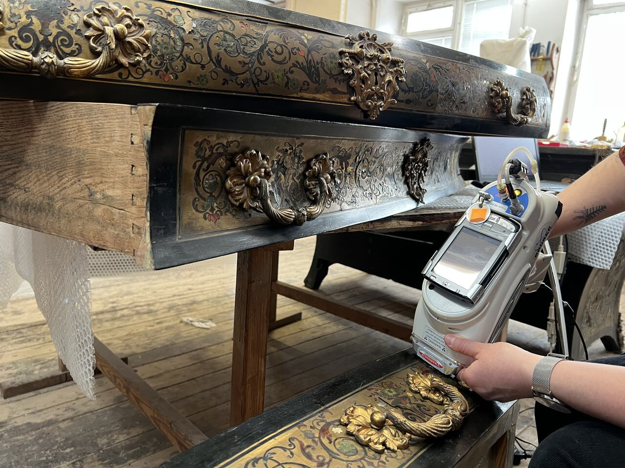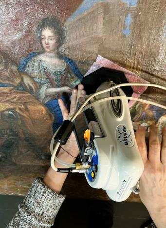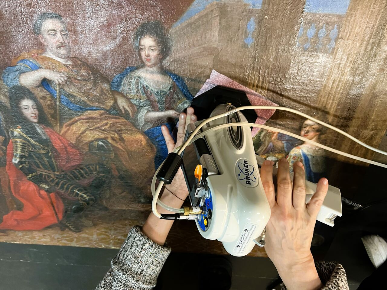 W kwietniu 2025 r. gościliśmy w Wilanowie grupę badaczek z Wydziału Chemii i Centrum Nauk Biologiczno-Chemicznych Uniwersytetu Warszawskiego. Przyjechały one z przenośnym spektrometrem fluorescencji rentgenowskiej (XRF), by dokonać pomiarów warstw malarskich portretu króla Jana III z rodziną oraz barwnych inkrustacji XVIII-wiecznej komody.