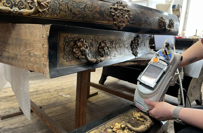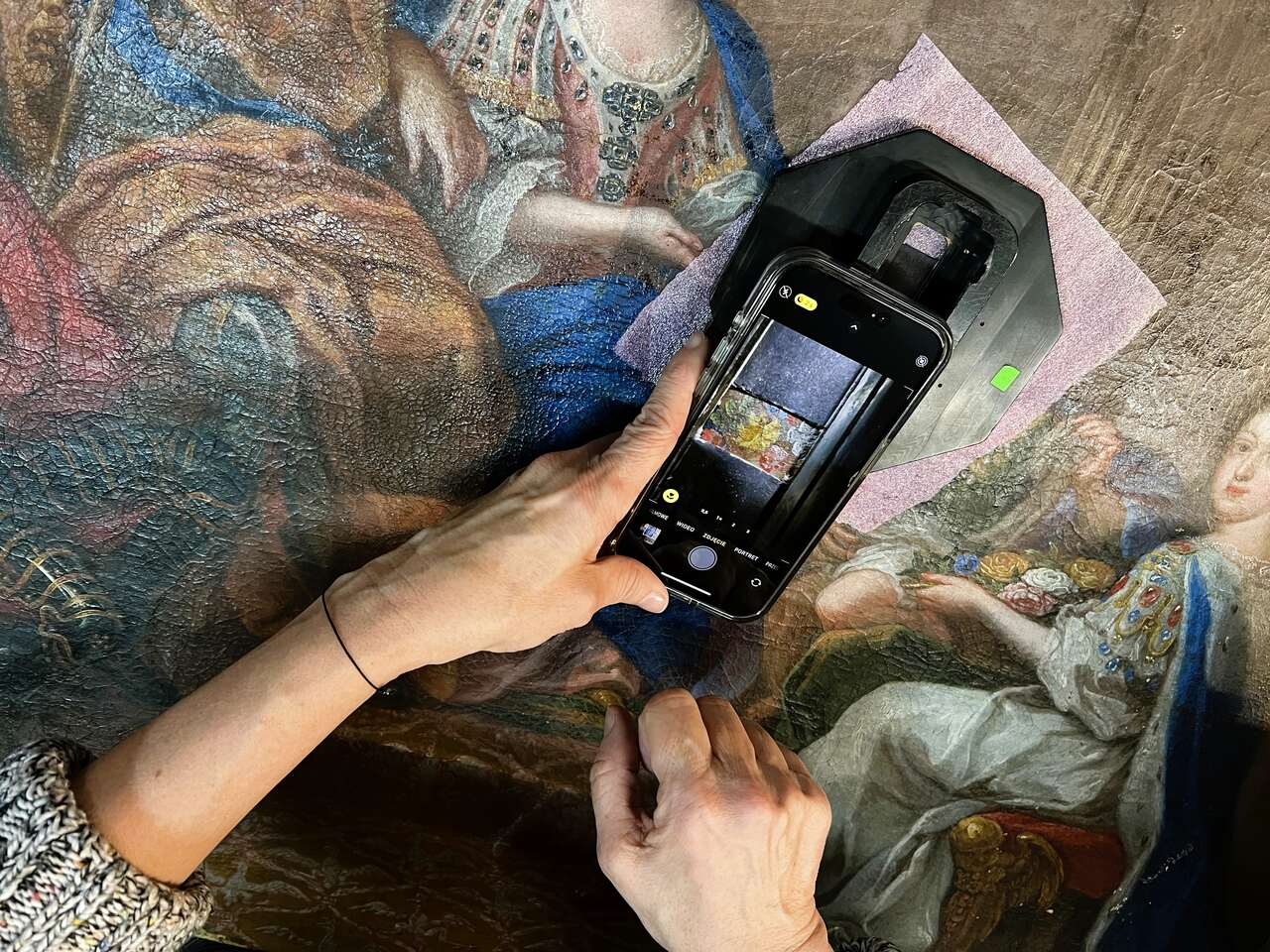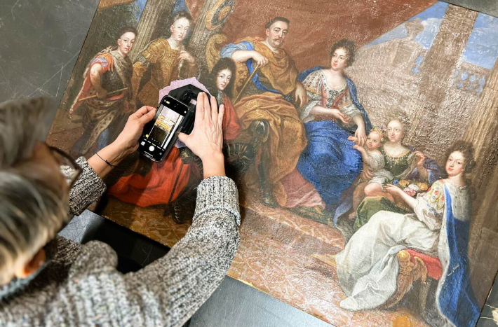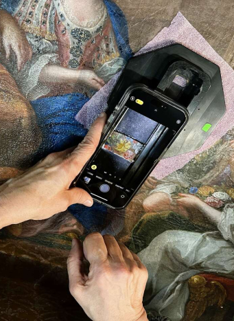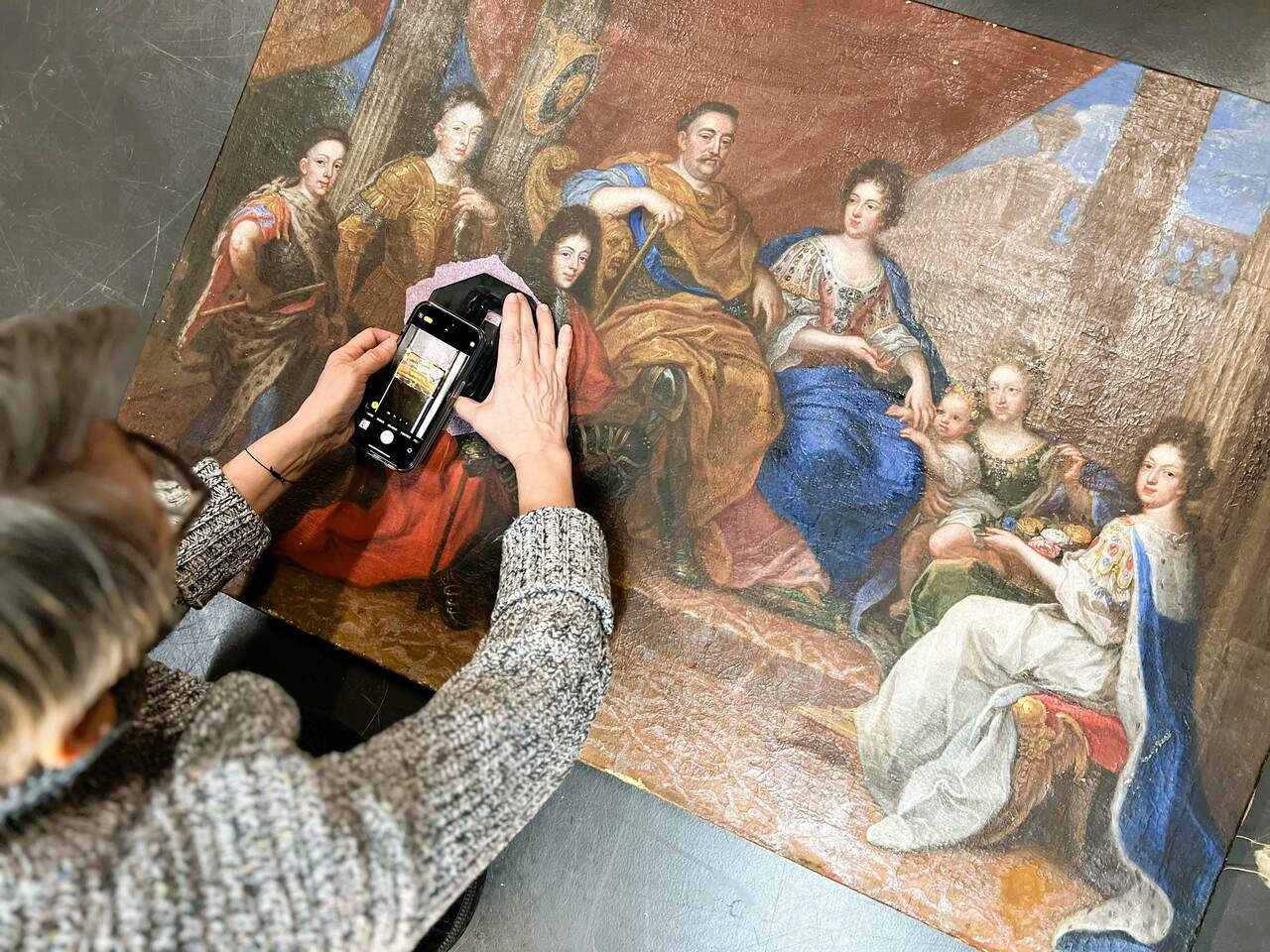 W kwietniu 2025 r. gościliśmy w Wilanowie grupę badaczek z Wydziału Chemii i Centrum Nauk Biologiczno-Chemicznych Uniwersytetu Warszawskiego. Przyjechały one z przenośnym spektrometrem fluorescencji rentgenowskiej (XRF), by dokonać pomiarów warstw malarskich portretu króla Jana III z rodziną oraz barwnych inkrustacji XVIII-wiecznej komody.