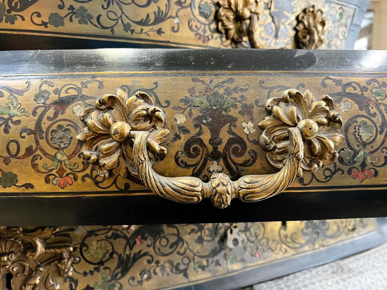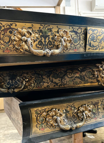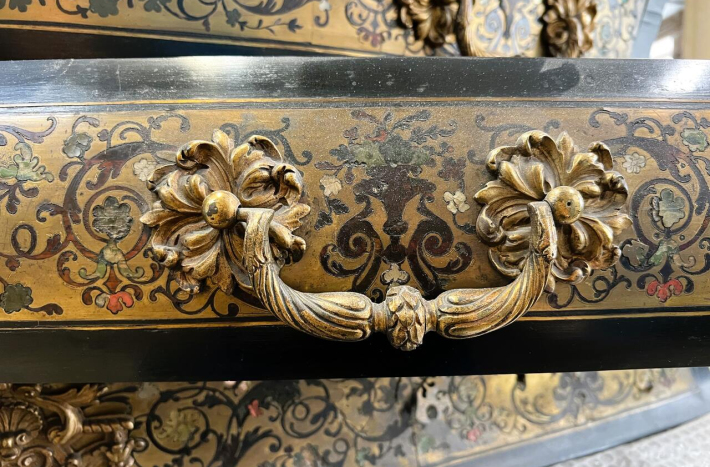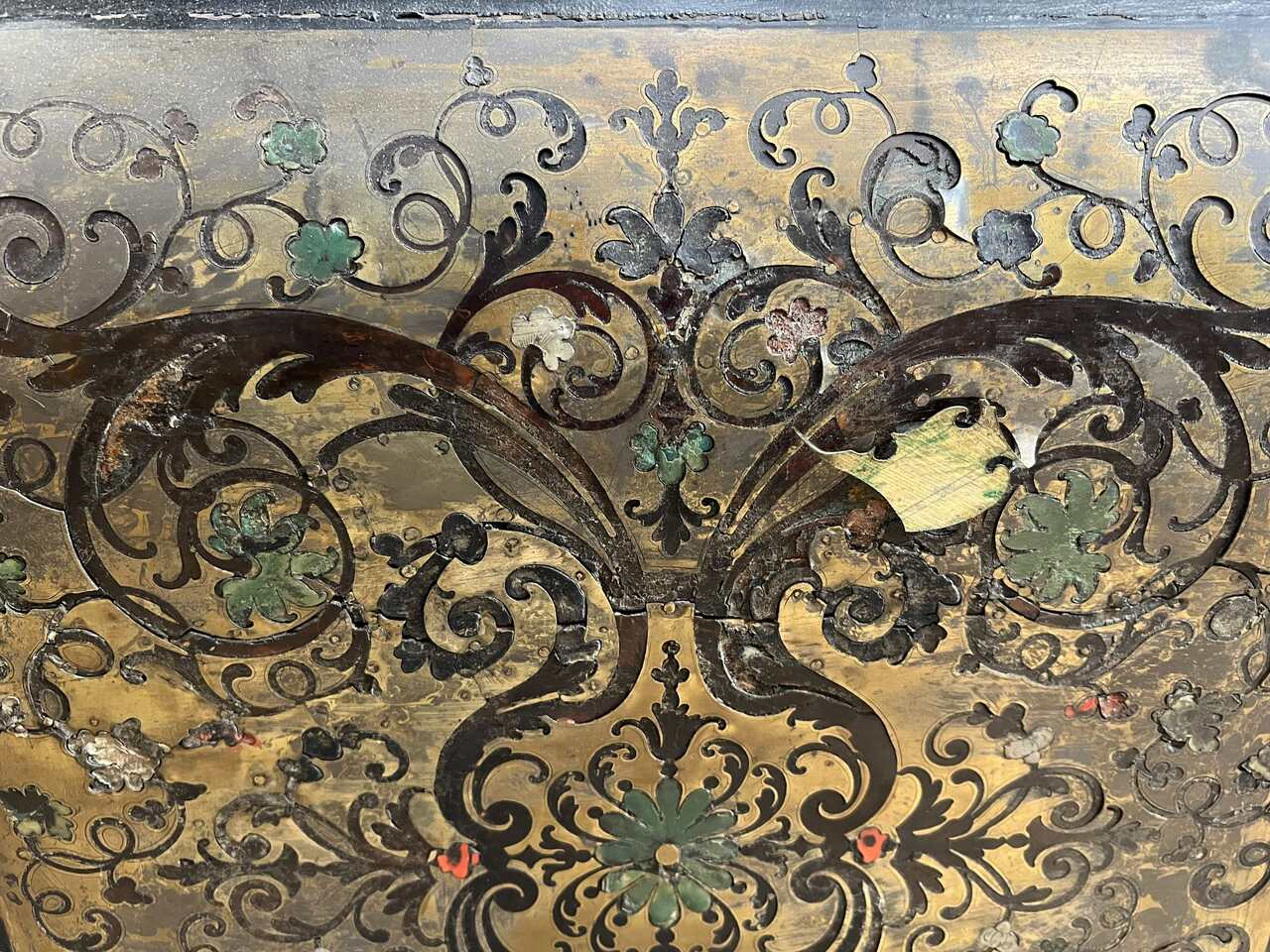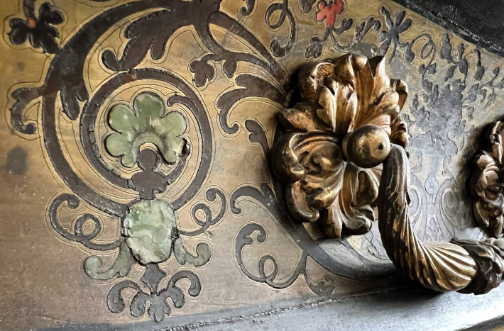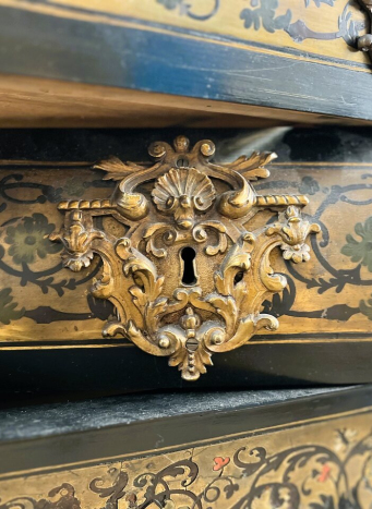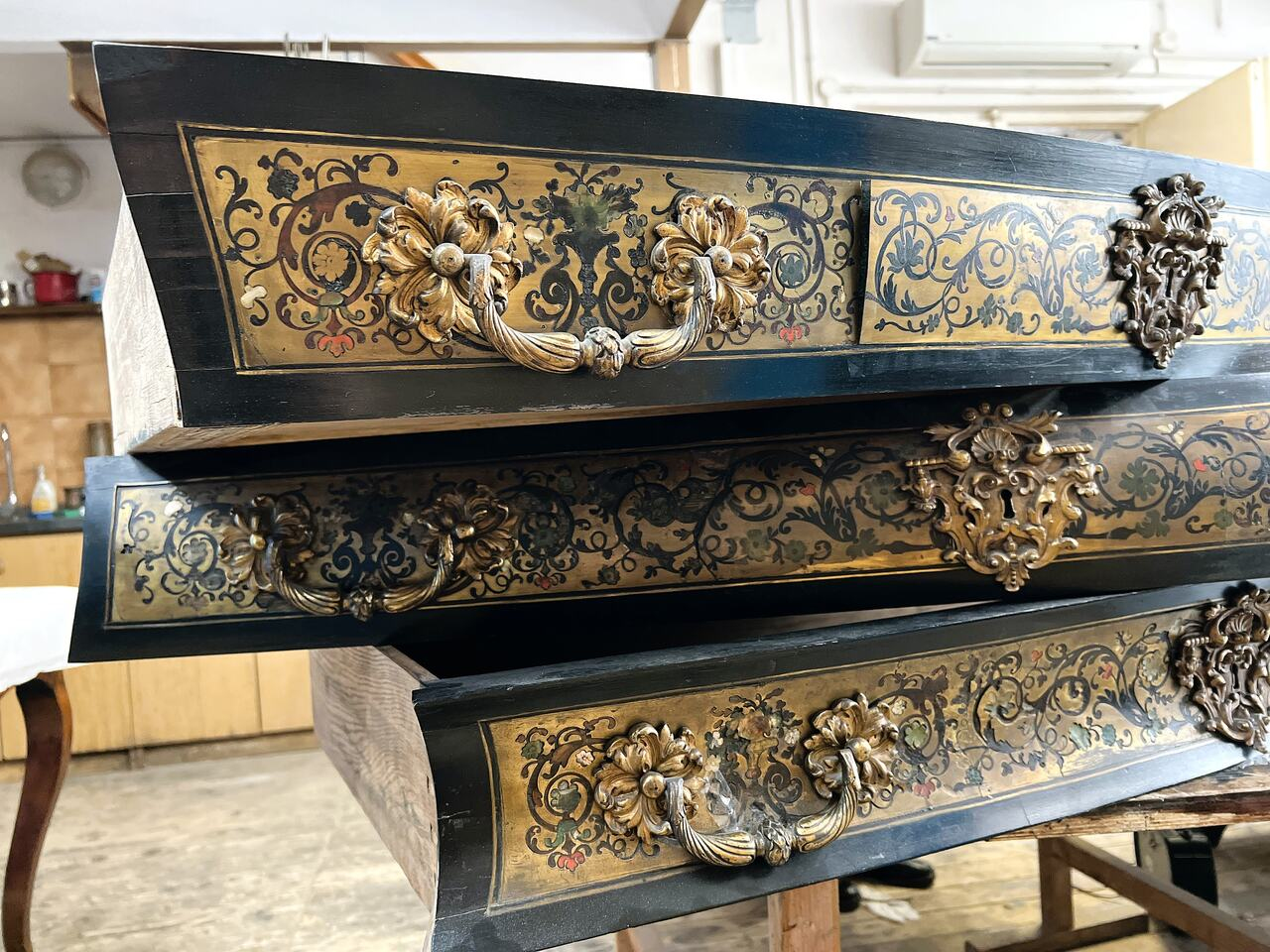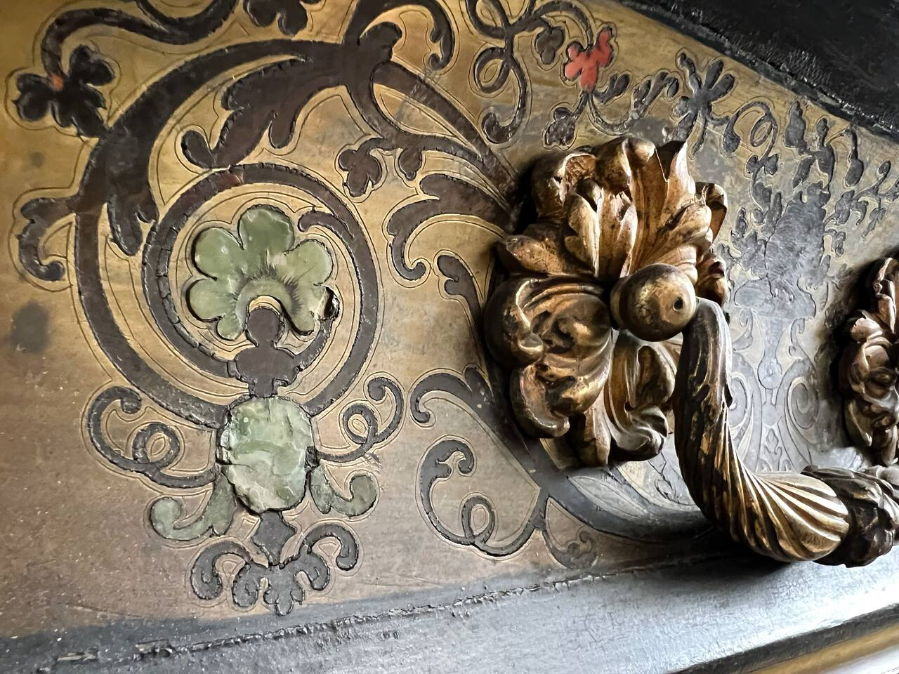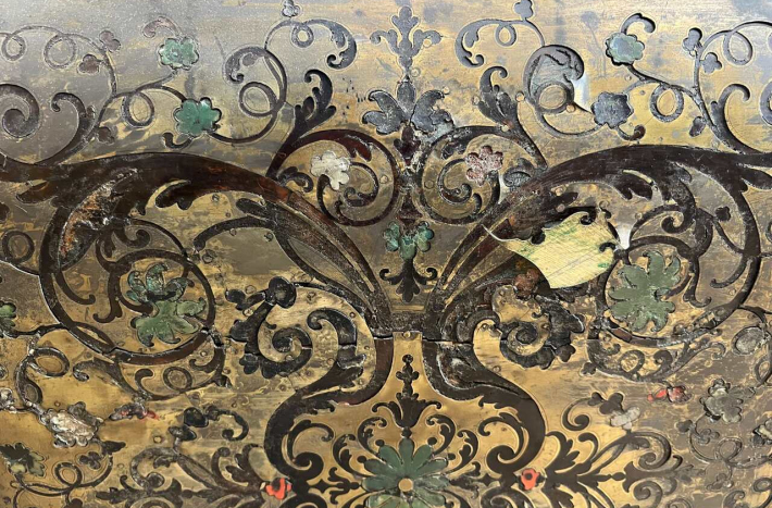 Inkrustowana laserowaną blachą mosiężną, szylkretem, kością oraz barwioną masą, prawdopodobnie kredowo-klejową.
