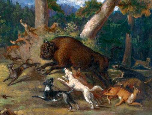 Malowidło na poziomej desce, w złotej ramie. Przedstawia grupę kobiet na tle lasu i zielonego pejzażu. Kobiety grają na instrumentach, lub rozmawiają ze sobą. Po prawej stronie na trawie leżą instrumenty muzyczne.