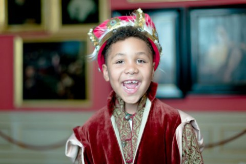 Uśmiechnięty chłopczyk w koronie i historycznym stroju, na tle czerwonej ściany z obrazami.