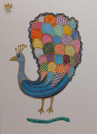 large colourful peacock made of lace fixed on canvas. Its uniqueness lies in the application of