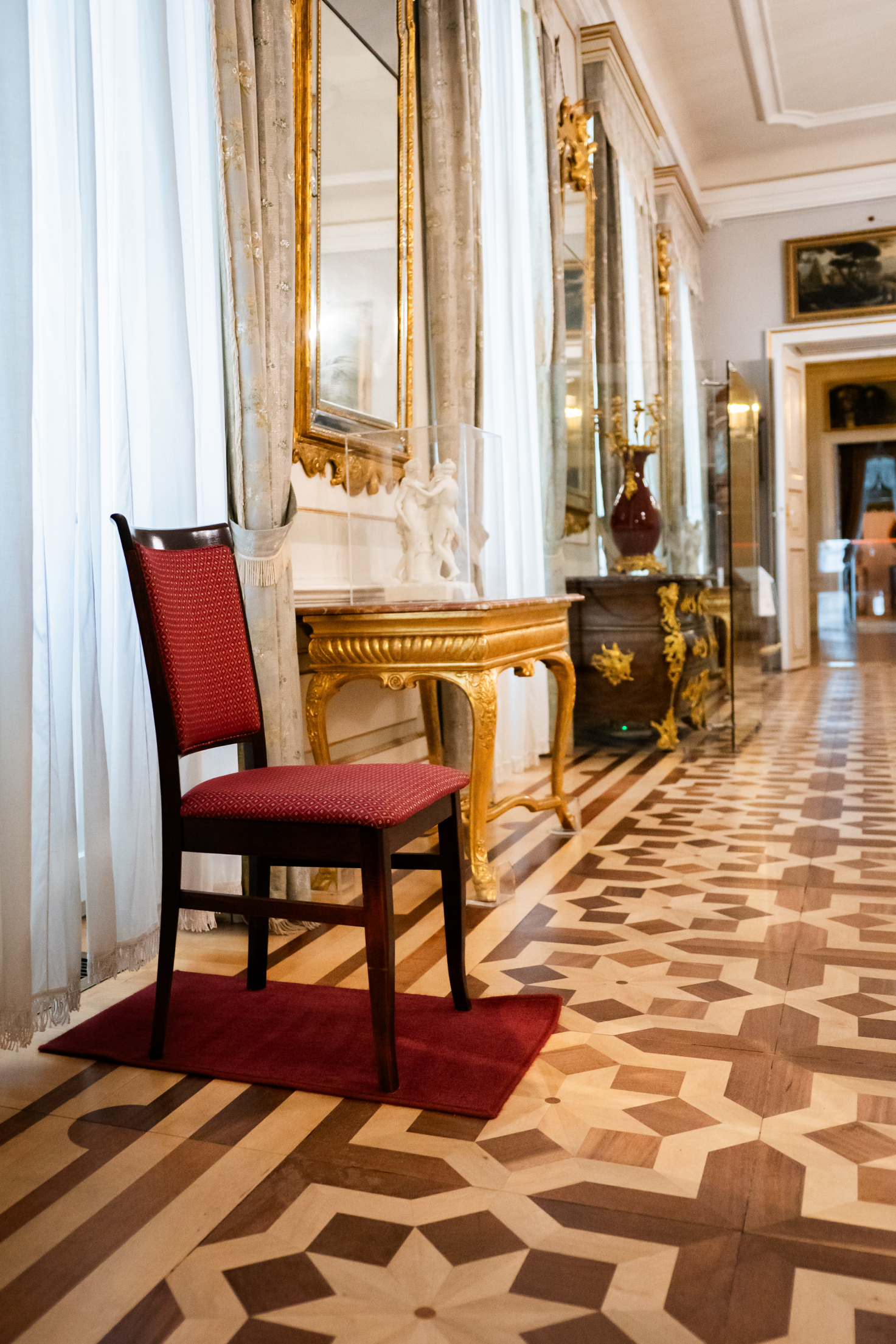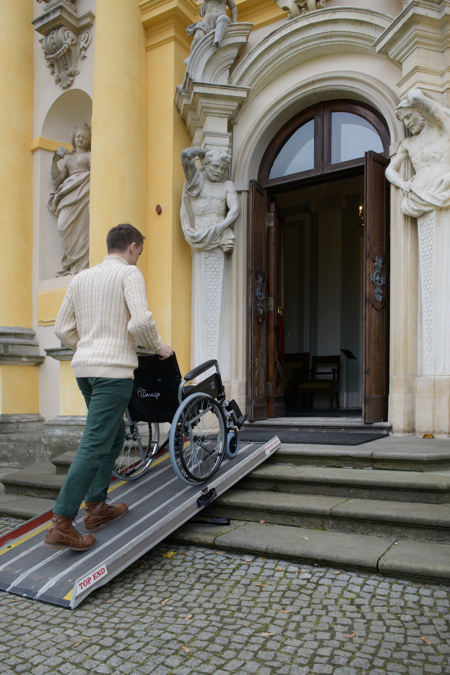 - The ground floor of the Palace and the park are accessible to people in wheelchairs. The Museum has foldable ramps to facilitate entry and exit from the Palace and movement around the ground floor of the Palace. IMPORTANT! Due to the historical nature of the place, not all thresholds have been removed yet, and the length of the ramps that we can use in the current conditions allows us to achieve a slope angle at the entrance and exit of 24%. Therefore, people in wheelchairs are asked to come to the Museum with an accompanying person.