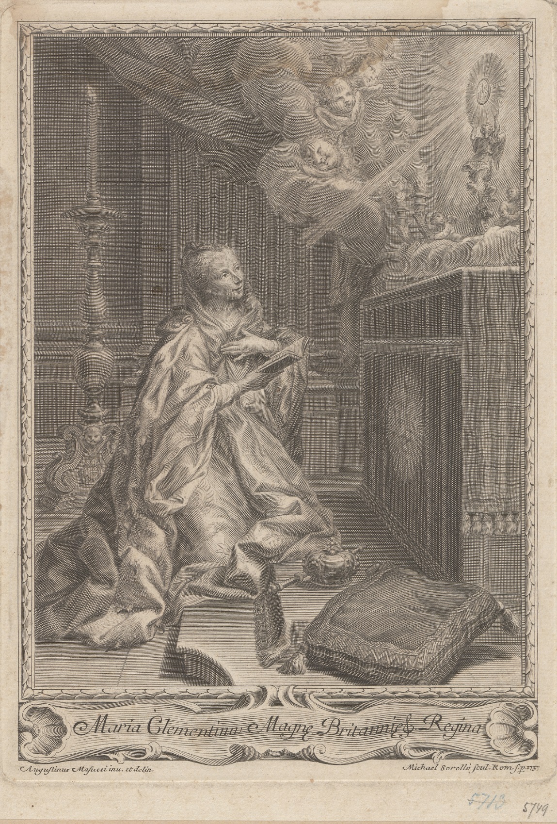 In 1736, Giovanni Maria Salvioni’s publishing house in Rome released a bilingual print entitled Parentalia Mariae Clementinae Magn. Britan. Franc. et Hibern. Regin. Jussu Clementis XII Pont. Max, a memorial to Clementina, who died on January 18, 1735, containing her biography and a detailed description of the grand funeral ceremonies organised in Rome at the behest of Pope Clement XII.