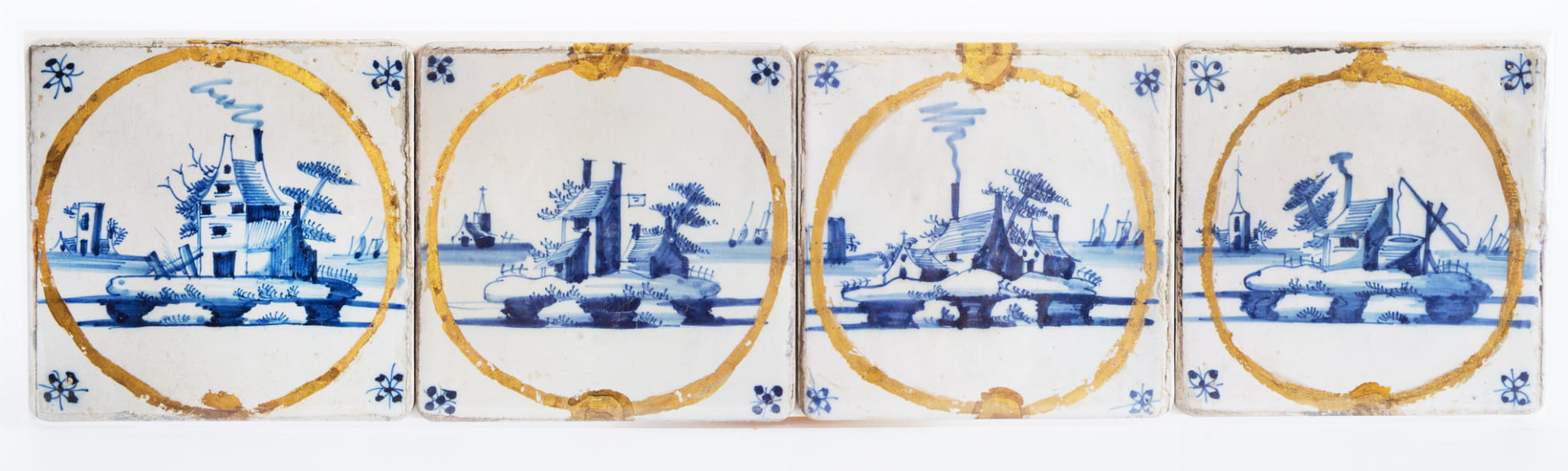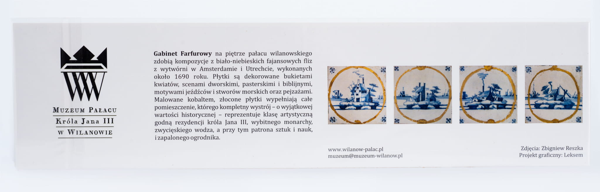 The set includes four cork placemats measuring 9.3 x 9.3 cm with a representation of tiles located in the Faience Cabinet on the first floor of the Wilanów Palace.