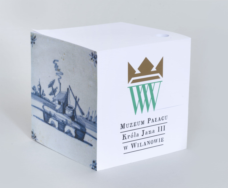 A cube-shaped notebook with a side print showing a decoration from the Faience Cabinet, circa 1690.