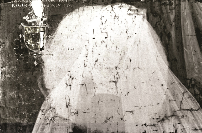Pierwotna warstwa malarska ma liczne uszkodzenia, widoczne w badaniach VIS, UV, IR, RTG i MAXRF. Twarz królowej jest dobrze zachowana, z minimalnymi ubytkami. Retusze i uzupełnienia zaprawy wykonano w różnych okresach, co widoczne jest w badaniach UV. Zachowano część dawnych przemalowań, zwłaszcza na kotarze i tle. Stary werniks zmienił kolor, matowiejąc i tworząc smugi, które zniekształcały odbiór dzieła.