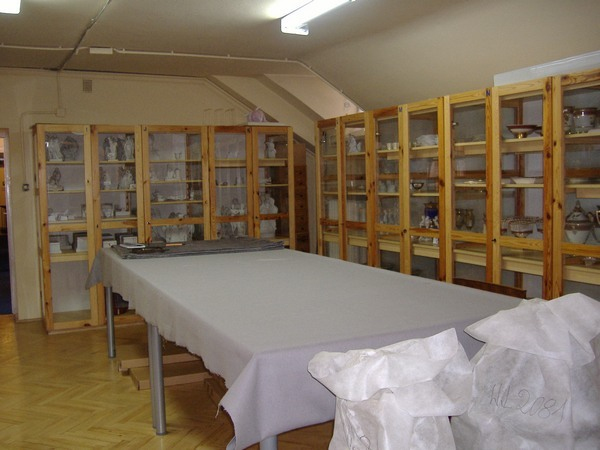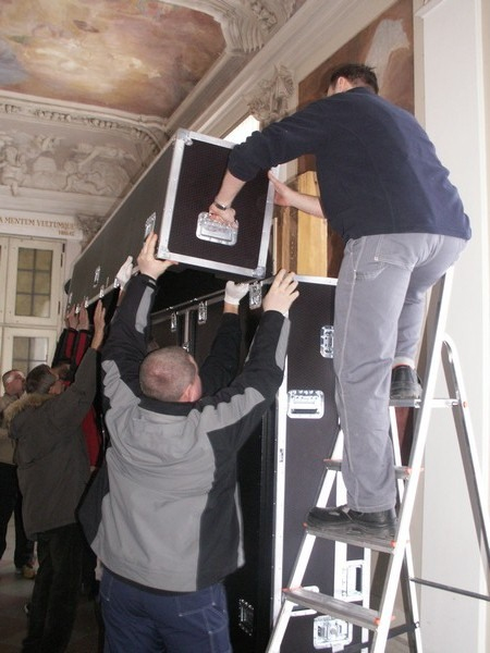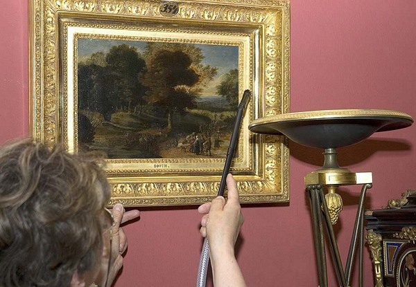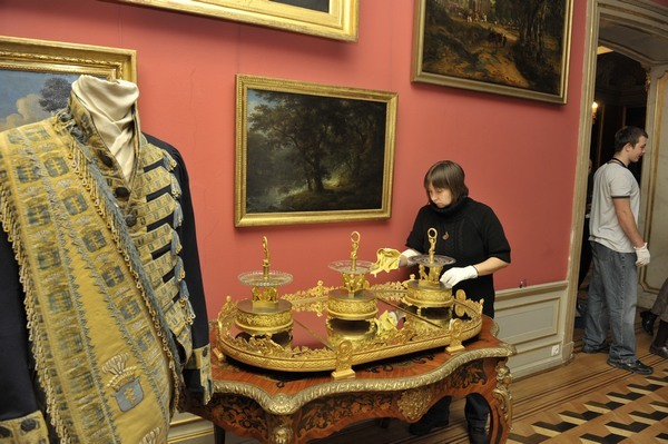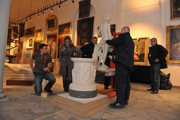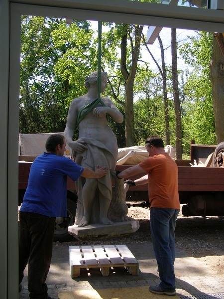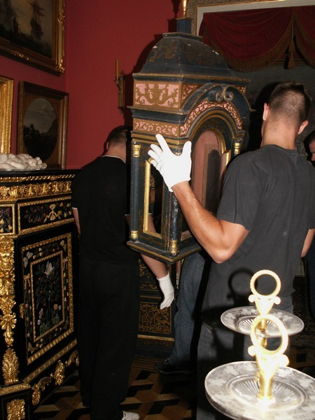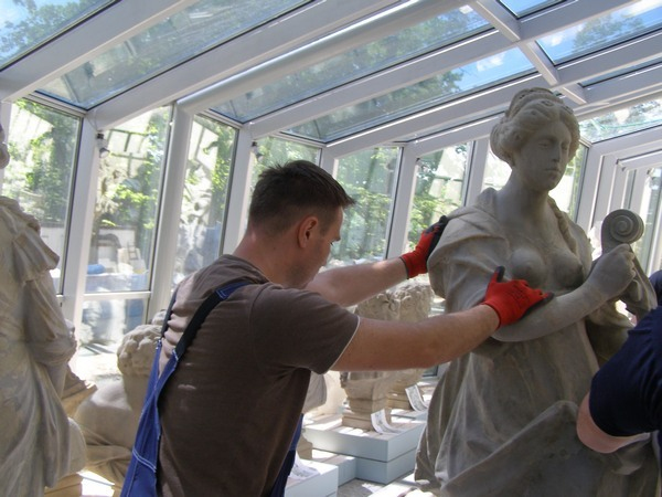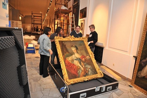 Pokój z drewnianą podłogą i dużym żyrandolem. Na ścianach wiszą ozdobne, złocone ramy z portretami. W centrum stoją przykryte meble, obok nich stół, a w rogu pomieszczenia znajduje się zdobiony piec kaflowy. Zielono-beżowy pokój w trakcie renowacji z elementami zakrytymi białymi płachtami. Na suficie widać ozdobną sztukaterię, a podłoga jest wyłożona czarno-białymi kaflami. W pomieszczeniu znajduje się drabina oraz meble osłonięte tkaniną. Wnętrze muzeum widziane przez przeszklone ściany. W środku znajdują się antyczne rzeźby, ustawione na postumentach. Pomieszczenie z długim stołem przykrytym materiałem, otoczone szafami z przeszklonymi drzwiami. Kobieta za pomocą specjalistycznego urządzenia dokonuje pomiarów na ścianie pokrytej ozdobną tkaniną . Obok znajduje się lustro w złoconej ramie i klasyczny kinkiet z żarówką. Widok na okno z delikatną zasłoną, za którą widać fragment ogrodu oraz część żółtej, zabytkowej fasady budynku. W tle roślinność i drzewa. Dwoje ludzi stoi przy dużym oknie z przejrzystą zasłoną. Światło z zewnątrz oświetla wnętrze, tworząc kontrast między ciemnymi sylwetkami postaci a jasnym tłem okna. Grupa ludzi pracuje przy przenoszeniu rzeźby. Rzeźba stoi na ozdobnym postumencie, a do jej podnoszenia używany jest specjalistyczny sprzęt. W tle widać ściany, na których wiszą dzieła sztuki. Pracownicy zajmują się zabezpieczaniem i przenoszeniem rzeźby w muzeum. Posąg umieszczany jest w specjalnym pojemniku wyłożonym ochronnym materiałem. Obok znajduje się podnośnik, który pomaga w transporcie. W tle widoczne są obrazy na ścianach. Dwóch mężczyzn pracuje przy wynoszeniu z pomieszczenia dużej kamiennej rzeźby, korzystając z podwieszonego pasa. W tle widać drzewa. Grupa ludzi przenosi duży obraz przedstawiający scenę ukrzyżowania Chrystusa. Obraz jest zabezpieczany w specjalnym pojemniku wyłożonym ochronnym materiałem. Pracownicy używają rękawiczek. Grupa pracowników znajduje się we wnętrzu z ozdobnym sufitem i przenosi duże skrzynie transportowe. Jeden z mężczyzn stoi na drabinie. Grupa pracowników przygotowuje do transportu duży obraz w ozdobnej, złoconej ramie. Obraz umieszczany jest w wyściełanej skrzyni transportowej. W tle widoczne są inne dzieła sztuki oraz rusztowania Pracownik w czerwonych rękawiczkach ostrożnie przenosi dużą kamienną rzeźbę kobiety w przestrzeni przeszklonej galerii. W tle widać inne rzeźby. Dwóch mężczyzn w białych rękawiczkach ostrożnie przenosi ozdobną, zabytkową szafkę. W tle widać bogato zdobione meble oraz obrazy na ścianach. Osoba stojąca na drabinie wykonuje prace konserwacyjne przy suficie ozdobionym sztukaterią. Cała przestrzeń jest zabezpieczona przezroczystymi foliami. Kobieta delikatnie czyści ozdobną, złoconą ramę obrazu przedstawiającego pejzaż. Używa do tego specjalistycznych narzędzi. Obraz wisi na ścianie w ciemnoróżowym pomieszczeniu, w którym znajdują się również inne zabytkowe elementy dekoracyjne. Kobieta w masce ochronnej i białym fartuchu czyści fragment zabytkowej tapety przy użyciu specjalistycznego narzędzia. Powierzchnia jest zabezpieczona taśmą. Osoba w białych rękawiczkach czyści ozdobne, złote naczynia ustawione na bogato zdobionym stole w eleganckim wnętrzu. Obok stoi manekin ubrany w dawny strój, a na ścianach wiszą obrazy w złotych ramach