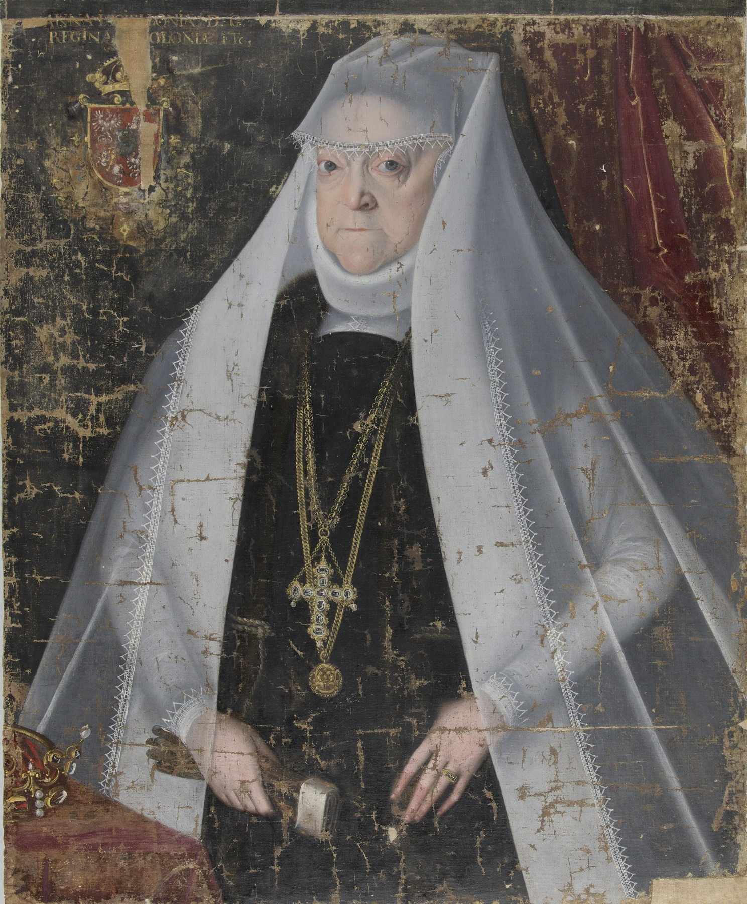 Zdecydowano się pozostawić wtórnie namalowaną inskrypcję. Szczegółowe badania MAXRF wykazały, że dolna część napisu na oryginalnym płótnie zawiera pigment cynowo-ołowiowy, identyczny z użytym w innych żółtych elementach obrazu, takich jak biżuteria, korona i kartusz herbowy. Oznacza to, że inskrypcja istniała pierwotnie, a jej pozostałości były na tyle widoczne, że pierwszy konserwator mógł ją wiernie odtworzyć.