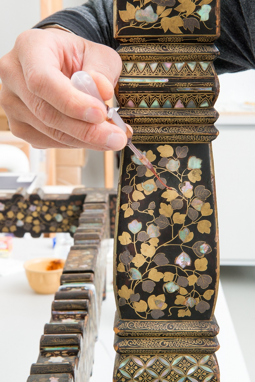Następnie uzupełniono kitem kokuso ubytki w miejscach odkrytego drewna. Tam, gdzie fragmenty masy perłowej dawno zaginęły, nie będzie rekonstrukcji. Powstałe krawędzie zabezpieczone zostały przed dalszą destrukcją opaską z masy zawierającej lakę. Na koniec cała powierzchnia nasączona została kilkakrotnie świeżą laką, która wypełniła mikropęknięcia. Proces ten nazywany jest urushigatame. Dzięki temu meblowi przywrócona została znaczna część utraconego blasku. Został on także zabezpieczony przed dalszym niszczeniem.