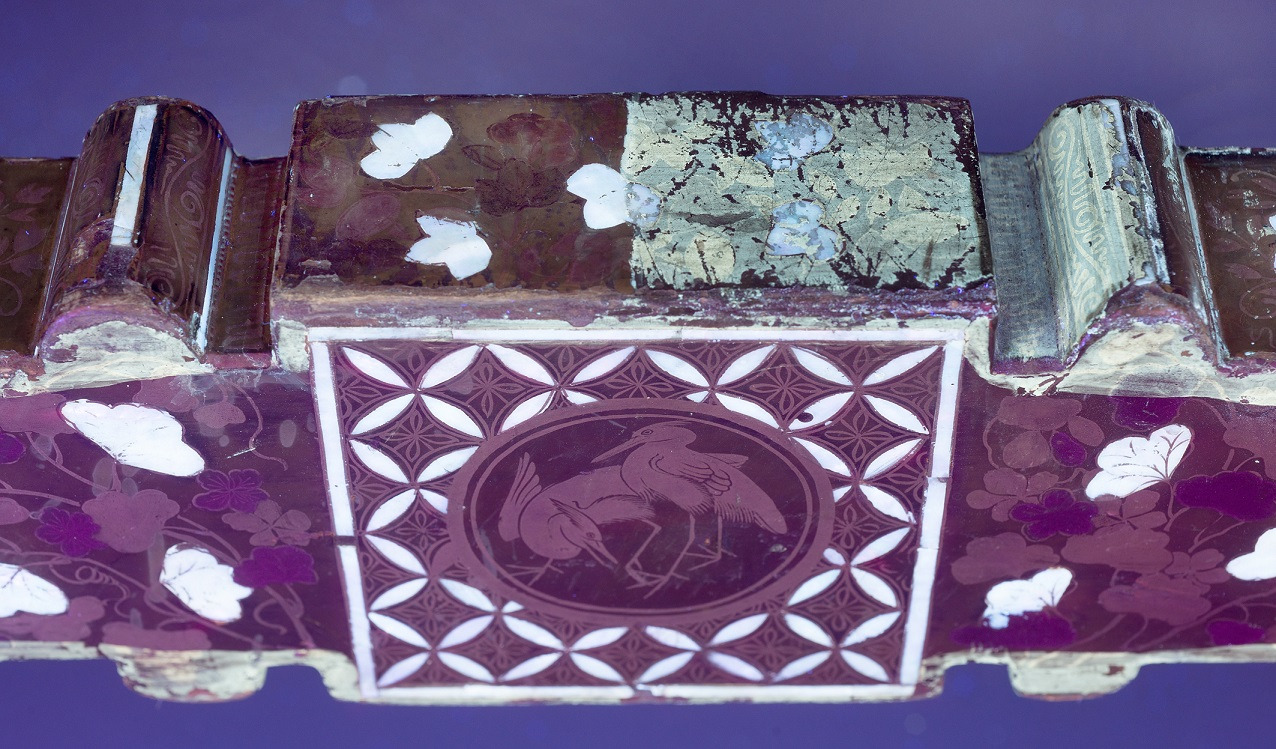 Fragment dekoracji stołu namban podczas usuwania zabrudzeń, wtórnych werniksów i przemalowań w świetle UV.