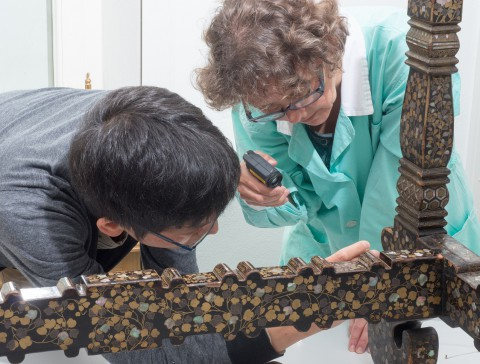 Konserwatorzy podczas pracy nad konserwacją stołu nanban.