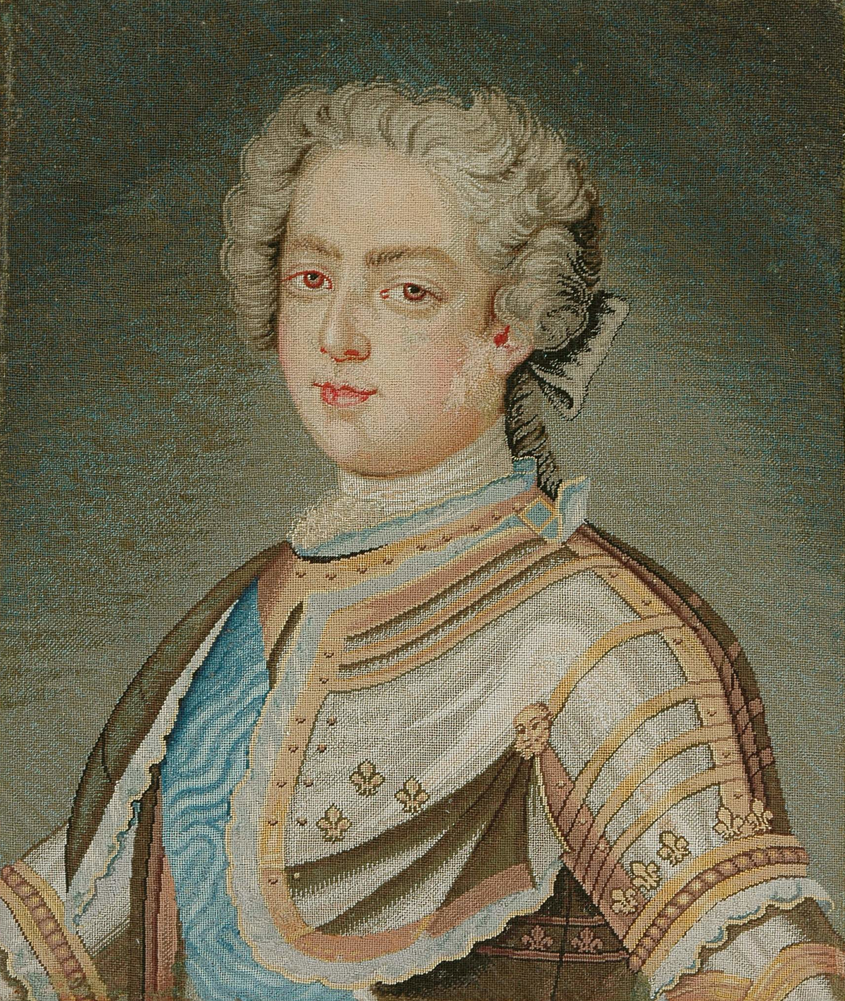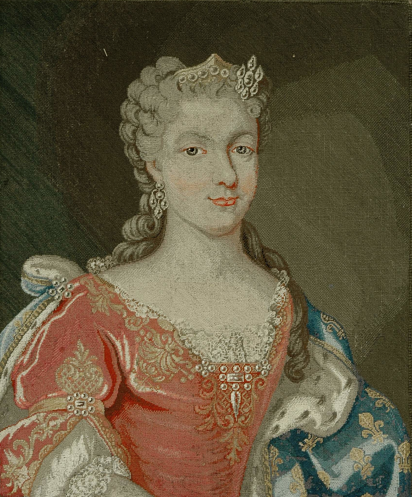 Leszczyńska ma jasną cerę, na której mieni się delikatny rumieniec. Królowa nieznacznie się uśmiecha. Ma drobne usta i ciemne oczy, spoglądające prosto na widza spod jasnobrązowych łuków brwi. Z ucha zwisa długi kolczyk z pięciu pereł. Ciasno skręcone loki pudrowanej peruki opadają królowej aż na plecy. Na jasnych puklach spoczywa złoty diadem, do którego z prawej strony przypięto ozdobę z siedmiu pereł stanowiącą komplet z kolczykami.