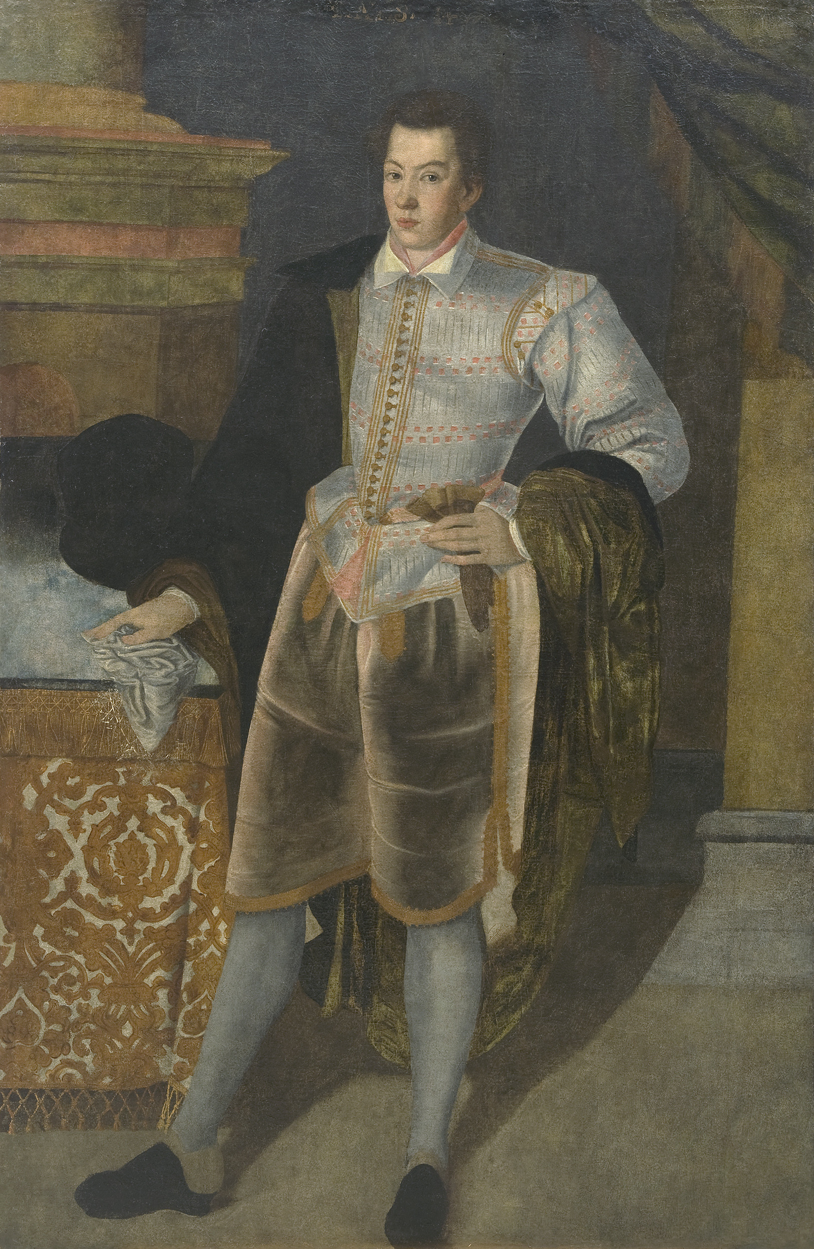 Po lewej stronie stoi niski stół przykryty kremową tkaniną o gęstym, złotym renesansowym wzorze. Spoczywa na nim prawa dłoń chłopca, w której trzyma też dodatkowo białą chusteczkę. Obok leży wysoki czarny kapelusz o wąskim rondzie.