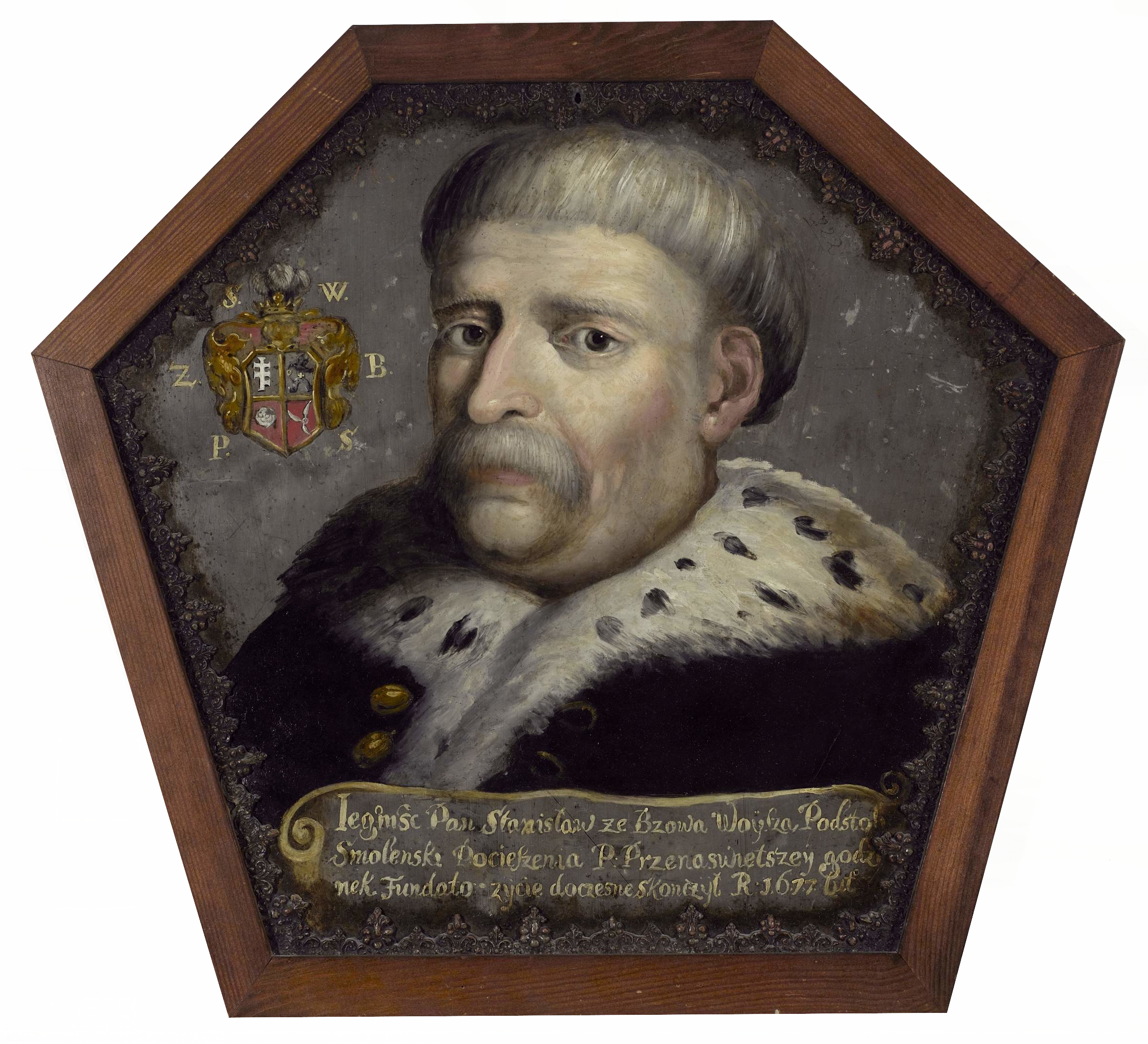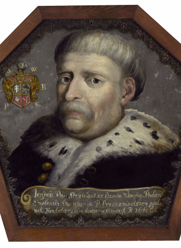 Po lewej, na wysokości twarzy mężczyzny, kartusz herbowy z czterema polami, zwieńczony złotym hełmem z pióropuszem z szarych piór. Górne pola herbowe szare, dolne czerwone. Wpisano w nie cztery herby, którymi posługiwał się ród portretowanego. Dookoła kartusza widnieją inicjały: S. W.|Z. B.|P. S., co może oznaczać: Stanisław Woysza z Bzowa, podstoli smoleński.