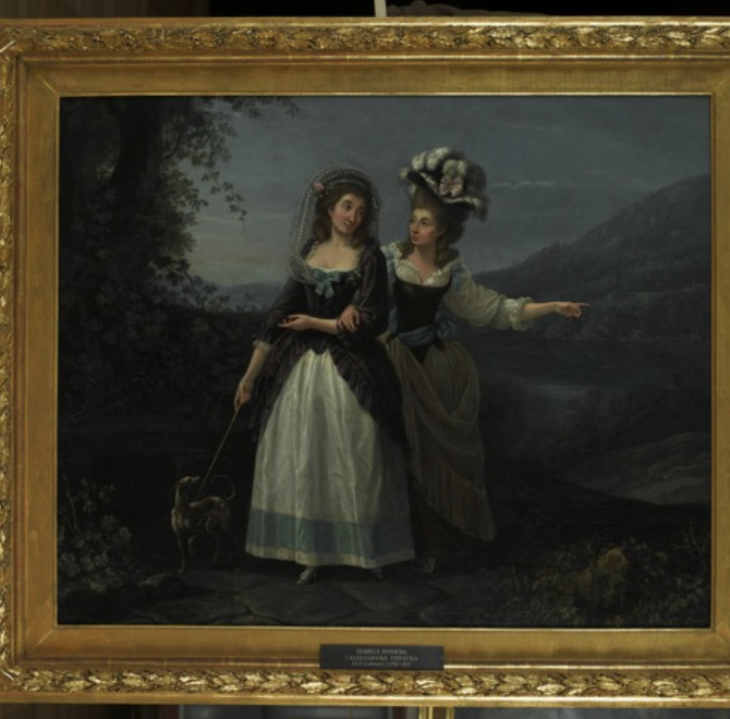 Potockie są modnie ubrane i uczesane. Mają na sobie suknie spacerowe popularne w latach 70. i 80. XVIII wieku. Aleksandra przedstawiona jest w ciemnofioletowej robe à la anglaise. To suknia składająca się z dopasowanego stanika zakrywającego sznurowanie gorsetu oraz z rozkloszowanej spódnicy, której krawędzie nie stykają się ze sobą z przodu, odsłaniając białą spódnicę spodnią. Krawędzie sukni Aleksandry ozdobione są falbankami, podobnie jak mankiety sięgających poniżej łokci rękawów, które dodatkowo obszyte są białą koronką. Ozdoby i gustowne dodatki utrzymane są w tym samym odcieniu turkusu – duża kokarda zdobiąca głęboki, kwadratowy dekolt, ozdobione białymi kokardkami pantofelki, szeroki pas biegnący u dołu spódnicy spodniej, a nawet wstążka w kasztanowych włosach Aleksandry, które opadają jej luźnymi lokami na ramiona. Do wstążki Potocka przypięła bladoróżową różę, a na głowę narzuciła ażurowy biały szal.