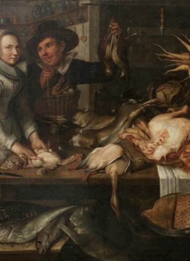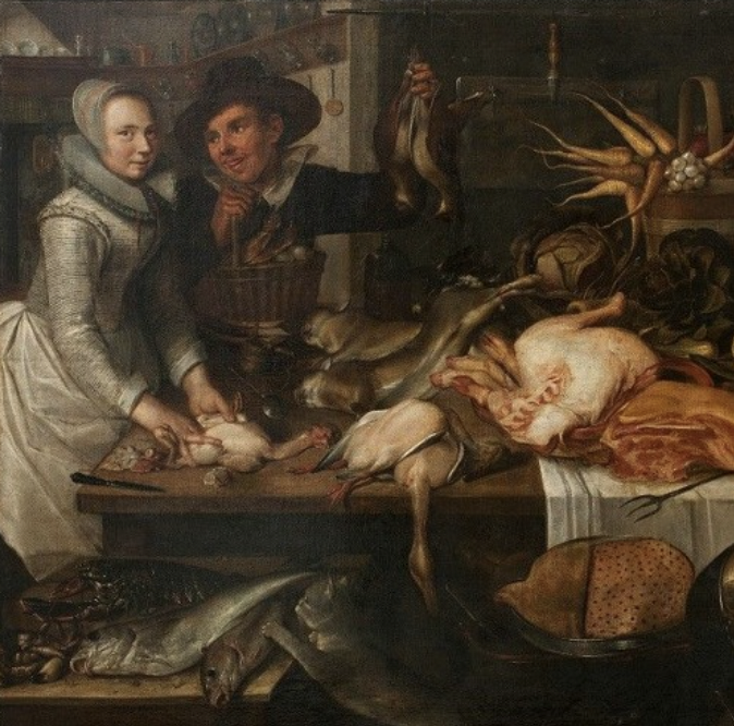Kuchnia i jedzenie to tematy często podejmowane w malarstwie holenderskim XVII wieku, gdzie służyły przede wszystkim jako motywy ikonograficzne o bogatej, rozbudowanej symbolice. Ryby, ptaki, zwierzęta oznaczają przemijanie, a jednocześnie są alegoriami żywiołów, szczególnie upodobanymi w sztuce baroku. Przedstawiona para to miłość ziemska, której erotyczny charakter podkreślają dodatkowo trzymane przez mężczyznę ptaki oraz kura przyrządzana przez kobietę. Wbrew pozorom bogactwo przedstawione w kuchni nie ma oznaczać dobrobytu, a raczej przestrzegać przed pokusami łakomstwa i chciwości. Mięso i obfitość kojarzone były wówczas na terenie Niderlandów przede wszystkim z grzechem.