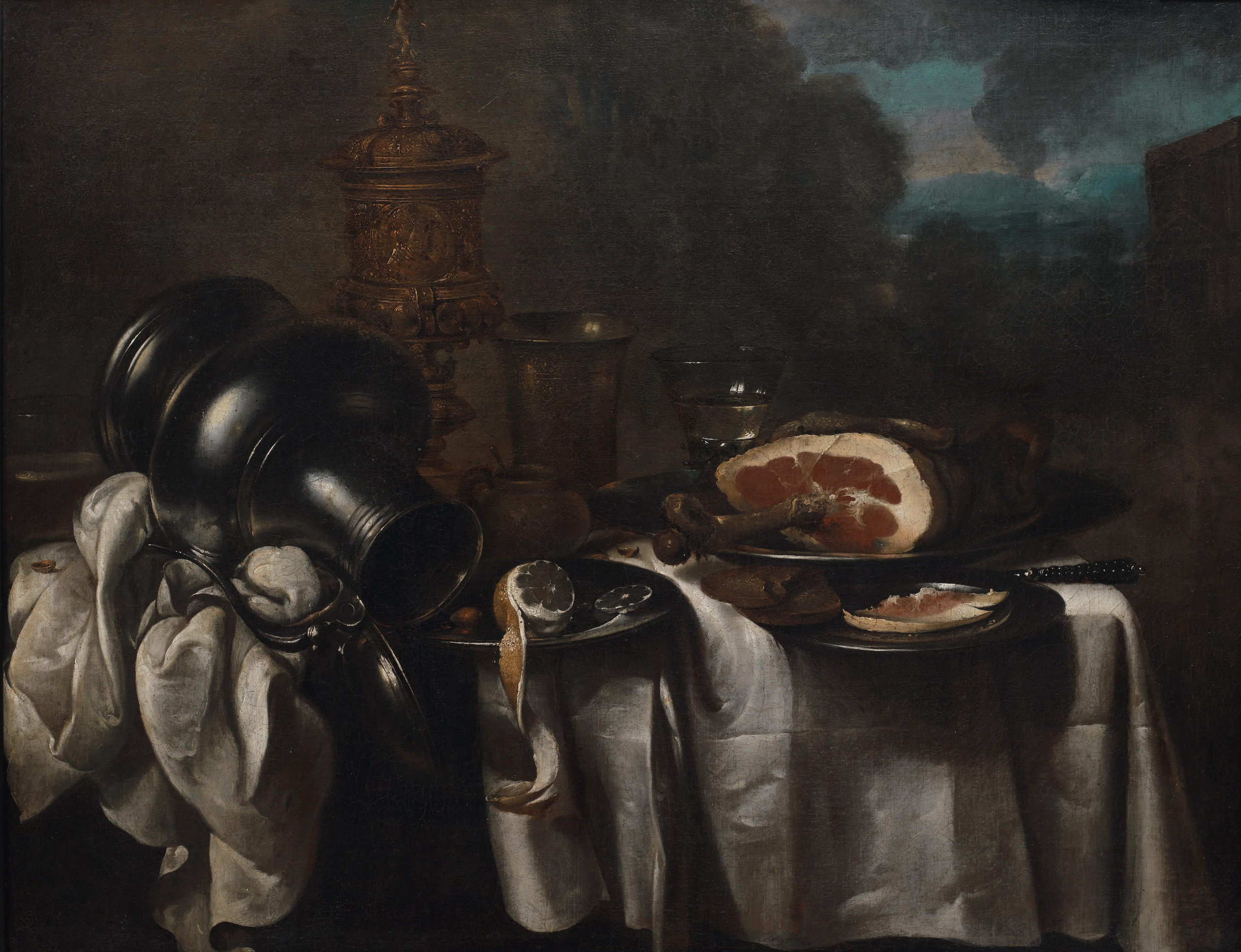 Z tyłu, po lewej, na stole stoi duży, ozdobny złoty puchar na wysokiej nóżce, z przykrywką zakończoną długim pionowym uchwytem. Powierzchnia pucharu, nóżka i przykrywka z uchwytem pokryte są płaskorzeźbionymi dekoracjami. Obok stoi mniejszy, również metalowy pucharek w kształcie gładkiego, rozszerzającego się u góry walca. Dalej – jeszcze mniejsza szklanka w kształcie odwróconego stożka, do połowy wypełniona bezbarwnym płynem.