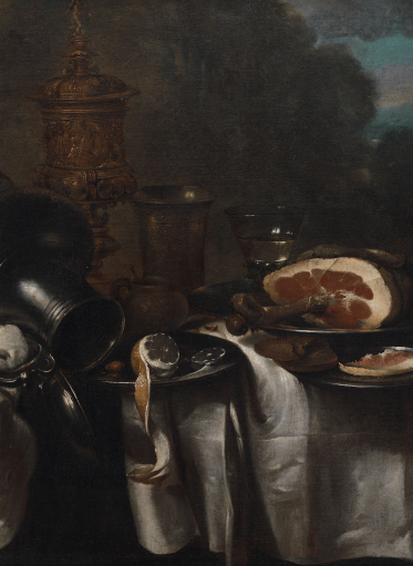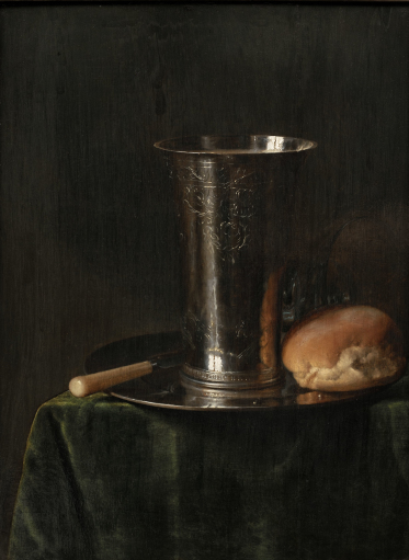 W centrum dzieła znajduje się stojący na talerzu srebrny kubek.