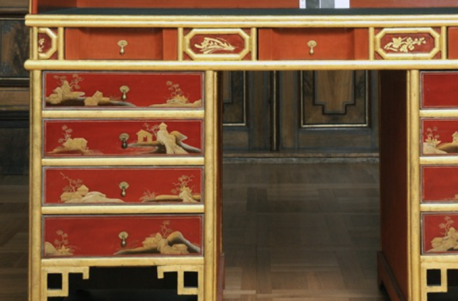 Mebel pokryty jest czerwonym lakierem o ciepłym, ceglastym odcieniu. Biurko zdobione jest złotymi listwami i ornamentami w stylu chinoiserie, czyli chińskim. Przednie ścianki szuflad zdobione są przedstawieniami chińskich pejzaży z pawilonami i domami pośród drzew. Częściowo reliefowane ornamenty malowane są złotym lakierem oraz oprószane złotem, co nadaje im zróżnicowaną fakturę. Z kolei na drzwiczkach tylnej części biurka rozkwitają malowane złotem i brązem pęki japońskich kwiatów, liści i jesiennych traw susuki. Boczne ściany biurka zdobione są listewkami ułożonymi w kratkę, której puste pola wypełniają pojedyncze pęki i gałązki różnorodnych kwiatów.