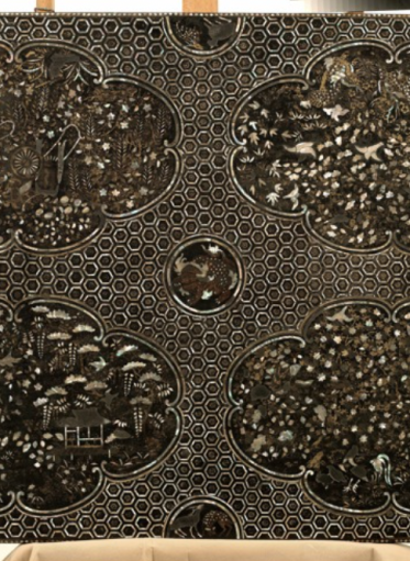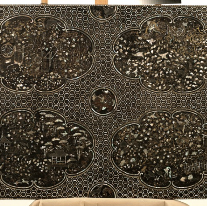 Cała czarna powierzchnia laki dekorowana jest skomplikowanym, bardzo gęstym wzorem. Prostokątny blat pokryty jest perłowym, geometrycznym ornamentem w kształcie sześciokątnego plastra miodu, zwanym kikko. W każdy sześciokąt wpisano drobną złotą chryzantemę. Cztery rogi stołu zajmują cztery duże poziome, owalne pola, przypominają one kształtem schematyczny rysunek chmury. W pola wpisano porośnięte liśćmi i kwiatami drzewa, spomiędzy których wyłaniają się zwierzęta. Perłowe gęsi, gołębie i koguty przemykają między skręconymi, złotymi gałęziami i połyskującymi liśćmi. Gdzieniegdzie, pomiędzy zaroślami, przebijają japońskie pawilony. W krzakach baraszkują zające. Na jednym z pól dwie niezaprzęgnięte dwukołówki czekają pod opadającymi gałęziami wierzby.