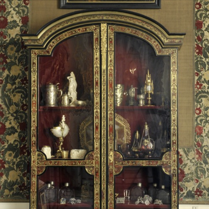 Najbardziej charakterystyczną cechą, która przesądza o niezwykłej wartości szaf, jest jednak dekoracja cienkich listew, w które oprawione jest szkło. Zdobione są one intarsją w technice Boulle’a. André Charles Boulle był nadwornym ebenistą, tj. wytwórcą mebli intarsjowanych na dworze króla francuskiego Ludwika XIV. Przez wielu uznawany był za najwybitniejszego artystę w swojej dziedzinie. Jako pierwszy zastosował w swoich wyrobach wykładanie ornamentami z brązu, kości słoniowej, masy perłowej i szylkretu.