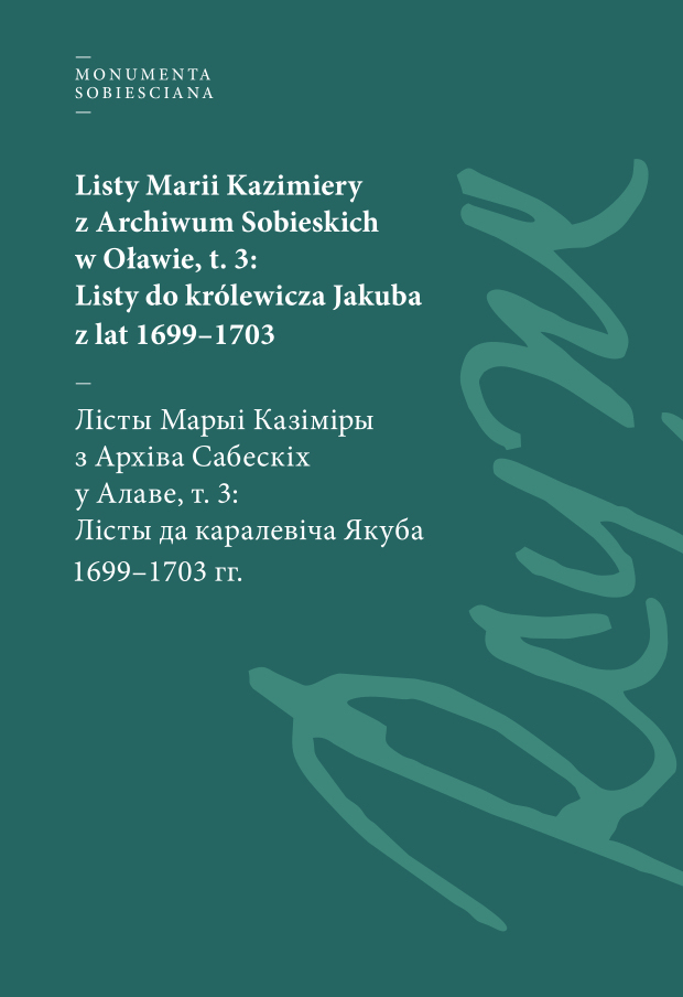 Listy Marii Kazimiery z Archiwum Sobieskich w Oławie, t. 3: Listy do królewicza Jakuba z lat 1699–1703, opracowanie i redakcja naukowa: Anna Czarniecka, tłumaczenie: Anna Leyk, seria „Monumenta Sobiesciana”, Warszawa 2024, ISBN 978-83-965839-8-7