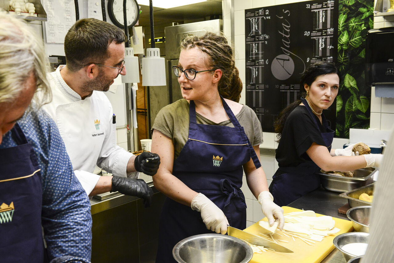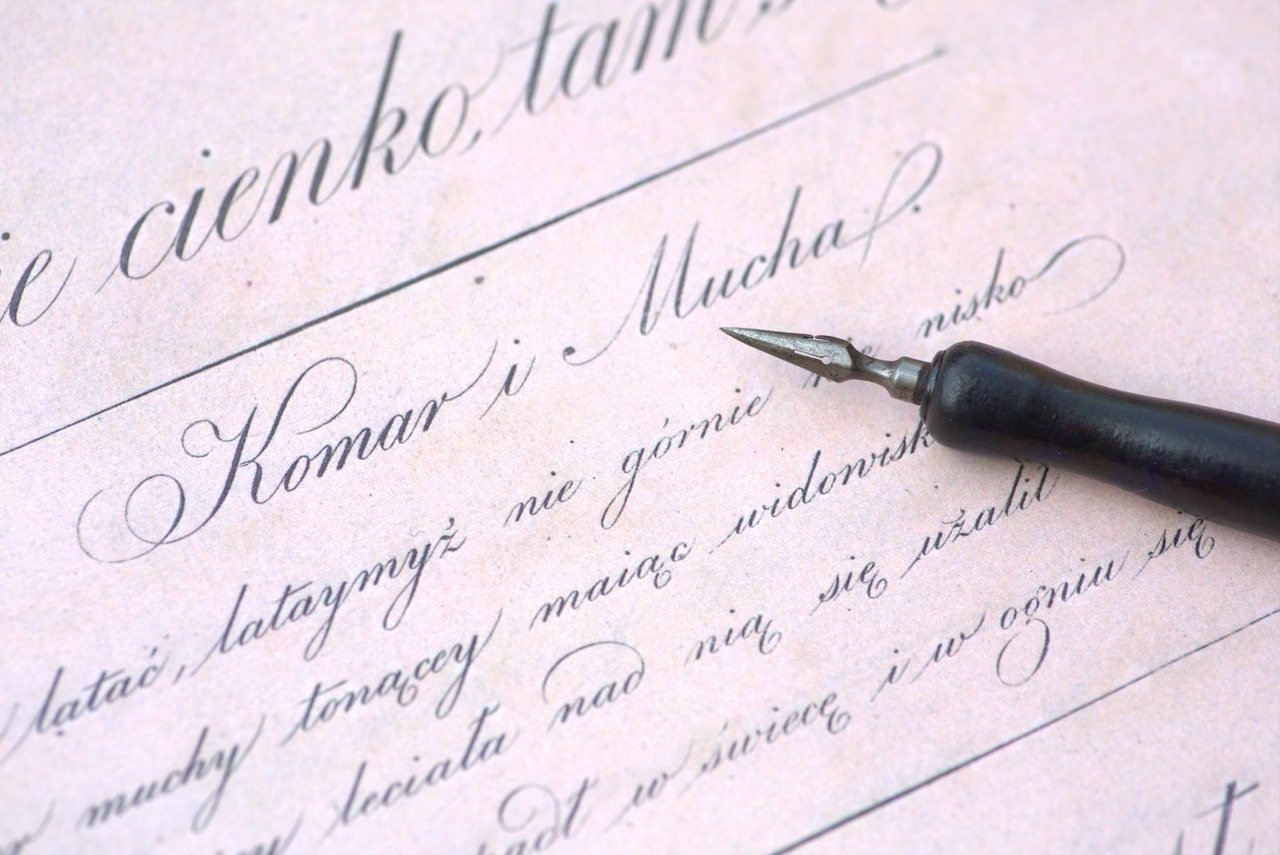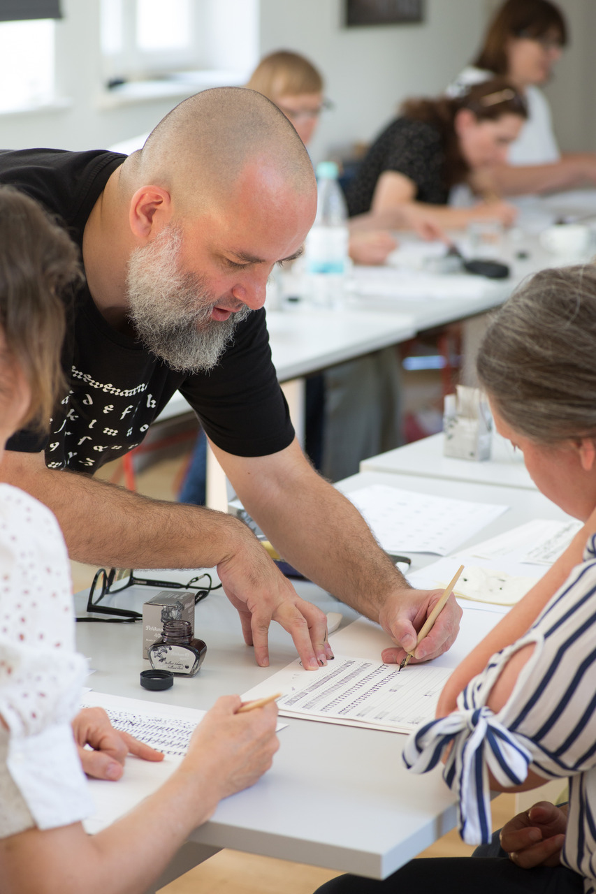 Mężczyzna uczy dwie kobiety kaligrafii - odręcznego pięknego pisma. Młoda kobieta stojąca w centrum wyjaśnia zagadnienie z kaligrafii grupie osób usadzonych przy stołach po dwóch stronach. Kartka papieru z odręcznie napisanym tekstem na której leży stalówka. Małe białe talerzyki na których jest danie. Czworo ludzi w kuchni w trakcie przygotowywania posiłku. Dwie osoby w centrum - mężczyzna i kobieta rozmawiają. Ozdobne tanie na talerzu. Obok na stole są sztućce, świeczki, szklanka i kieliszek. Mężczyzna w fartuchu (kucharz) w trakcie przygotowywania potraw ustawionych w takich samych talerzach. Grupa ludzi pozuje do zdjęcia przed budynkiem z kolumienkami. Grupa osób siedzi przy stole i jest w trakcie spotkania. Na ścianie widnieje prezentacja, o której opowiada jeden z uczestników.