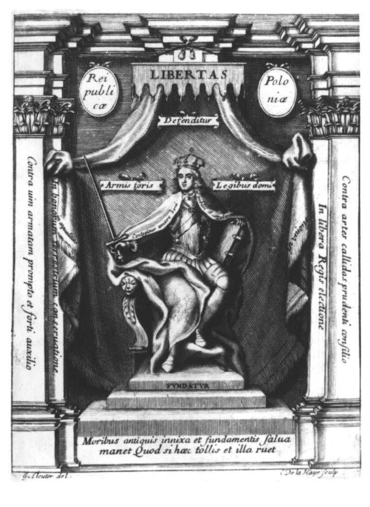 Rycinę, zamówioną przez młodego Sobieskiego, wykonali: grafik Charles de La Haye (1641 - ?), od 1689 r. czynny w stolicy, według rysunku Jerzego Eleutera Szymonowicza – Siemiginowskiego (zm. przed 1711), nadwornego malarza królewicza Jakuba Ludwika. Przedstawia ona elekta jako personifikację polskiej Wolności, ubranego w zbroję i w płaszcz królewski, w koronie na głowie, siedzącego na tronie z napisem LIBERTAS. Młodzieniec wspiera lewą rękę na zamkniętej księdze, opartej o udo, w prawej trzyma pionowo wzniesiony miecz. Ruch i układ  nóg nawiązuje do projektowanego przez Cirro Ferriego portretu Ferdinanda II Medici, który Eleuter musiał widzieć w Palazzo Pitti we Florencji. Na płaszczu występuje jako  motyw dekoracyjny ukoronowany Orzeł Biały. W obrębie kompozycji rozrzucone są liczne napisy, objaśniające symboliczne treści, wobec których oblicze elekta staje się mniej ważne i schodzi na plan dalszy.