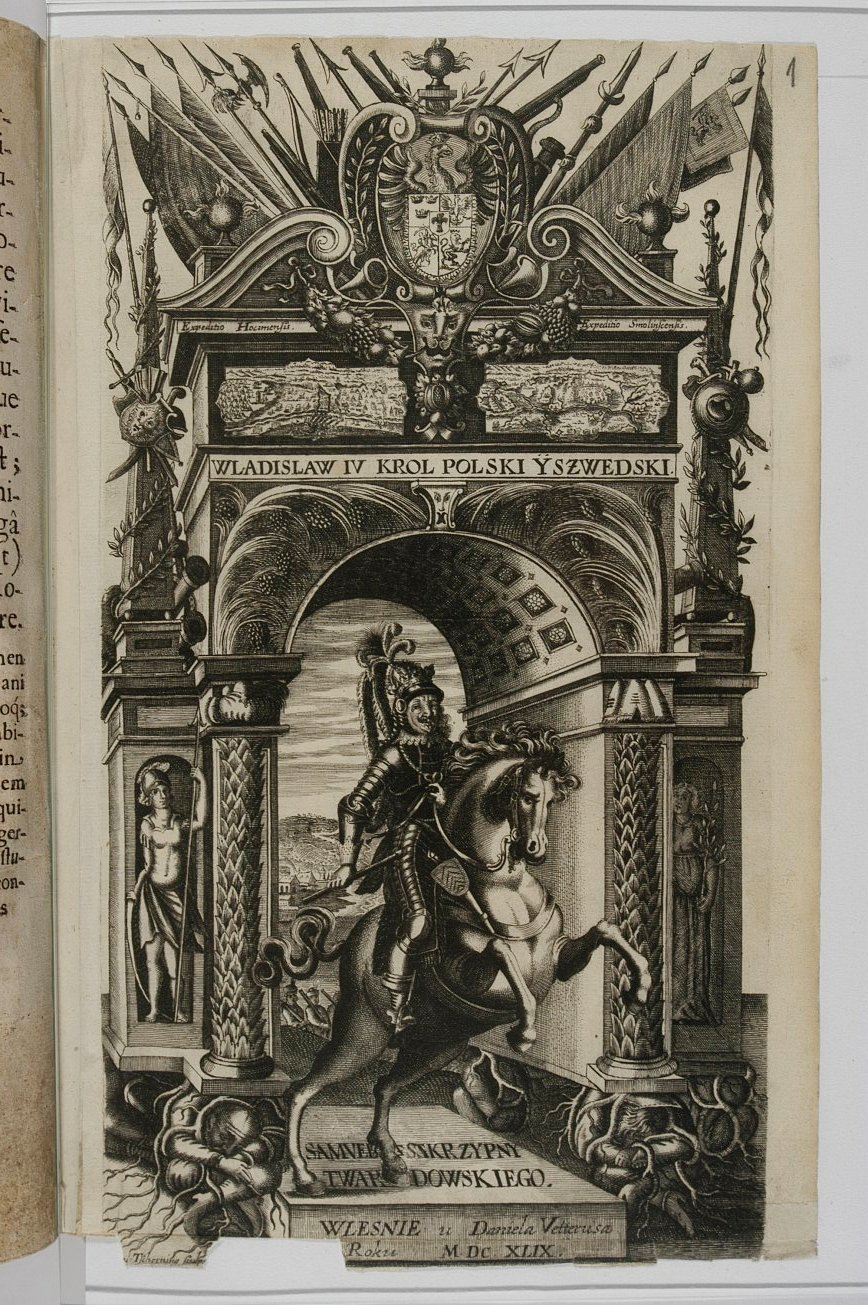 Dzieło zaopatrzono w kartę tytułową, sztychowaną w Krakowie przez śląskiego grafika, Dawida Tscherninga. Miedzioryt przedstawia dynamiczny portret konny Władysława IV, przejeżdżającego w skoku przez łuk triumfalny. Monarcha nosi kirasjerską zbroję i szyszak rycerski, a w ręce trzyma regiment – odznakę najwyższego dowództwa. Zwraca też uwagę monumentalne zwieńczenie arkady z wolutowym kartuszem, mieszczącym w sobie Orła Białego, na którego piersi widnieje wielopolowa tarcza z herbami Polski i Szwecji oraz Snopkiem Wazów.
