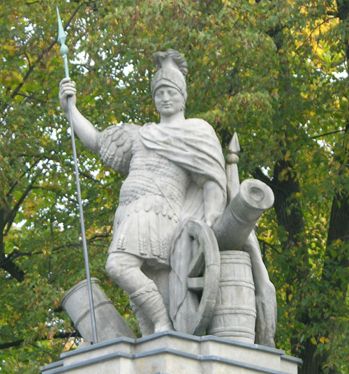 Kolorowe zdjęcie współczesne. Przedstawia fragment ściany pałacowej w Wilanowie. Widzimy tam freski ze scenami z Eneidy na elewacji ogrodowej pałacu w Wilanowie.