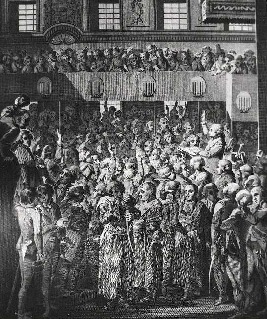Grafika z napisem „Dzień Trzeci Maia Roku 1791" i przedstawieniem nagiej kobiety siedzącej przy obelisku i piszącej coś na ziemi. Naokoło sceny wieniec roślinny.