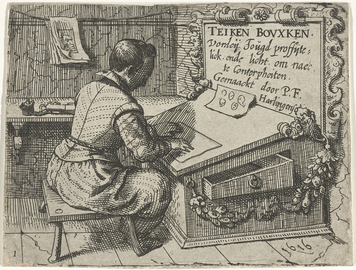 Grafika przedstawia wnętrze pałacowe, z drzewem, w dużej donicy, pod którym siedzi kobieta w stroju antycznym, w hełmie na głowie. Obok niej zgromadzone małe putta i książki. Putta rozmawiają z kobietą, inne się bawią. Jest to Minerwa we wnętrzu biblioteki.