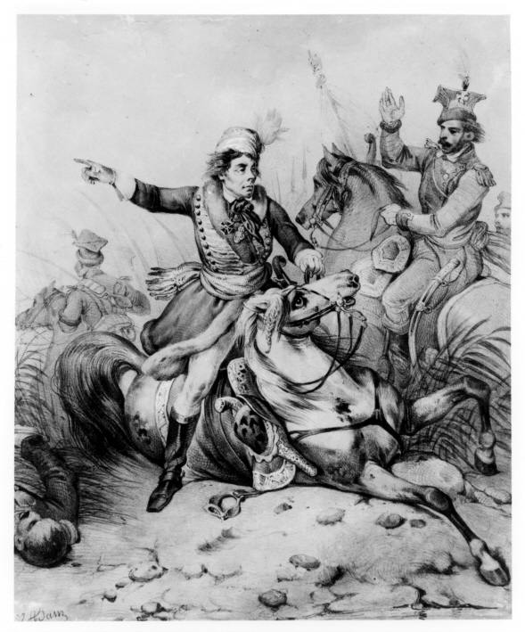 Scenę wzięcia Kościuszki do niewoli uwieczniali, zazwyczaj w rysunkach, artyści polscy XVIII i XIX w. (np. Jan Piotr Norblin, Michał Stachowicz, Jan Krzysztof Damel), zazwyczaj ex post. W grafice ów temat podejmowali głównie artyści obcy, jak np. wzięty paryski malarz i litograf Victor Adam (1801 - 1866). Kompozycja przedstawia Naczelnika, wstającego z leżącego na ziemi konia. Trzymając wciąż cugle w lewej ręce, prawą wskazuje coś nadjeżdżającemu polskiemu oficerowi – nic nie zapowiada jeszcze dramatu, który nastąpi za chwilę. Jakkolwiek opisanej francuskiej litografii daleko do artystycznego poziomu, klimatu i autentyzmu szkicu piórkiem Norblina, wypełniała ona w jakimś stopniu wyobraźnię dziewiętnastowiecznych pokoleń Polaków w kraju i na obczyźnie.