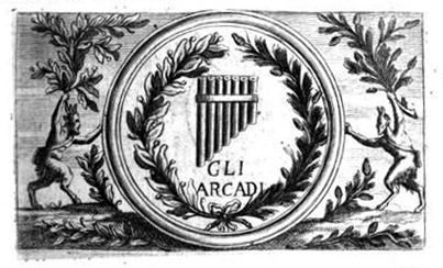 Herb Arkadii, rycina z dzieła Giovanniego Maria Crescimbeniego „L'istoria della volgar poesia”, Roma 1714, domena publiczna