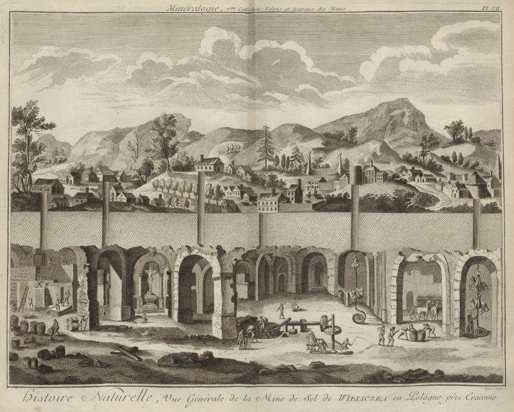 Co więcej, redaktorzy Encyklopedii zdecydowali się – rzecz niezwykle rzadka – zobrazować definicje z dziedziny mineralogii i eksploatacji soli ryciną prezentującą „Widok na Kopalnie Soli w Wieliczce w Polsce pod Krakowem”. Akwafortę wykonał na specjalne zamówienie Robert Bénard (1734 – ok.1780). Poszukując źródła ikonograficznego, które posłużyło do kompozycji Bénarda, natrafimy na rycinę Philiberta-Benoît de La Rue (1718–1780) zadedykowaną delfinie Marii Antoninie przez wydawcę – Georges’a-Louis Le Rouge’a (1712 – ok. 1790), geografa królewskiego Ludwika XV. Całość kompozycji w obu przypadkach jest bardzo fachowa.