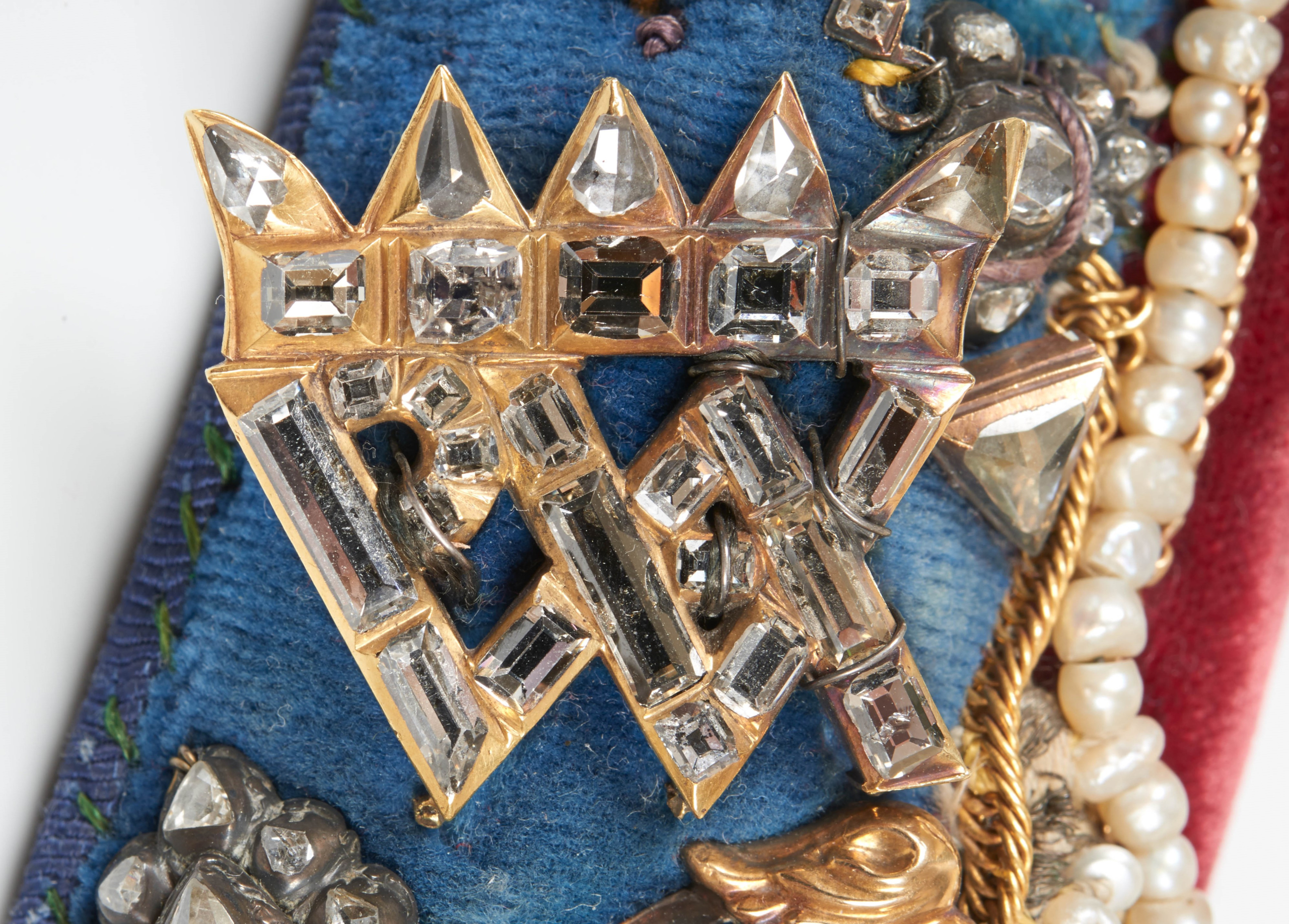 To efektowne złote zawieszenie dekorują połączone ze sobą litery APV (ich prawidłowa kolejność nie jest pewna) umieszczone pod pięciopałkową koroną. Zdobi je 27 diamentów o bardzo tradycyjnych szlifach, którym daleko jeszcze do popularnych od 2. połowy XVII wieku szlifów brylantowych. Całość uzupełnia na odwrocie biała emalia. Doskonale zachowany klejnot naszyty jest na tzw. sukienkę diamentową obrazu Matki Boskiej Częstochowskiej – znajduje się na chuście otaczającej twarz Marii (a więc w miejscu wyjątkowo zaszczytnym), po lewej stronie dla patrzącego. Identyfikacja zawieszenia nie pozostawia żadnych wątpliwości, gdyż zostało ono dokładnie opisane jako dar żony królewicza Jakuba w jasnogórskim spisie wotów pod datą 28 lipca 1697 roku (w zestawieniu znalazł się drobny błąd, podano bowiem liczbę diamentów zawyżoną o jedną sztukę, ale pomyłki takie często się zdarzały). Jakub Sobieski i jego żona od 26 czerwca 1697 roku przez kilka tygodni przebywali w sanktuarium jasnogórskim w czasie trwania elekcji po śmierci Jana III. Jakub był jednym z pretendentów do tronu polskiego, ale jego kandydatura szybko okazała się nierealna. Niemniej, nie lekceważąc symbolicznej wymowy religijnych gestów, królewicz i jego żona złożyli w narodowym sanktuarium wota przypominające o zasługach Jana III: Jakub ofiarował Matce Boskiej m.in. płaszcz królewski swojego ojca, który najpierw nosił podczas uroczystości w klasztorze.