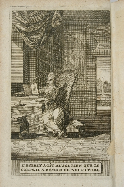 Grafika przedstawia wnętrze izby. Na środku stół i krzesło na którym siedzi mężczyzna, pod nogami ma skórę z lisa. Na ścianie wiszą obrazy. Głębiej widać łóżko z baldachimem. Na zewnątrz, nad grafiką herb, naokoło kompozycji symbole bitwy. Jest to Jan Chryzostom Pasek spisujący wspomnienia.