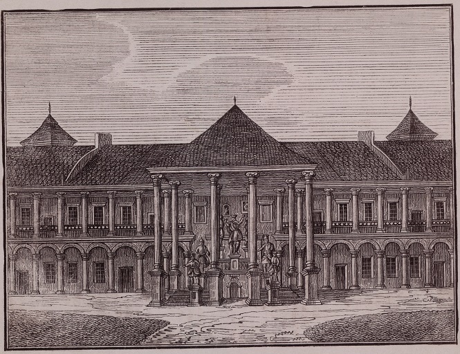 Stara rycina. Przedstawia fasadę pałacową z kolumnadą i wejściem dekorowanym rzeźbami. Jest to Zamek Sobieskich w Żółkwi od strony dziedzińca.