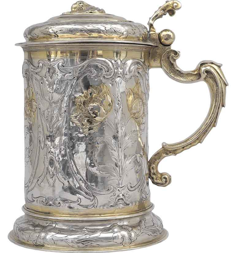Srebrny kufel ze złotymi ozdobami w kształcie kwiatów i roślin. Ucho wygięte.